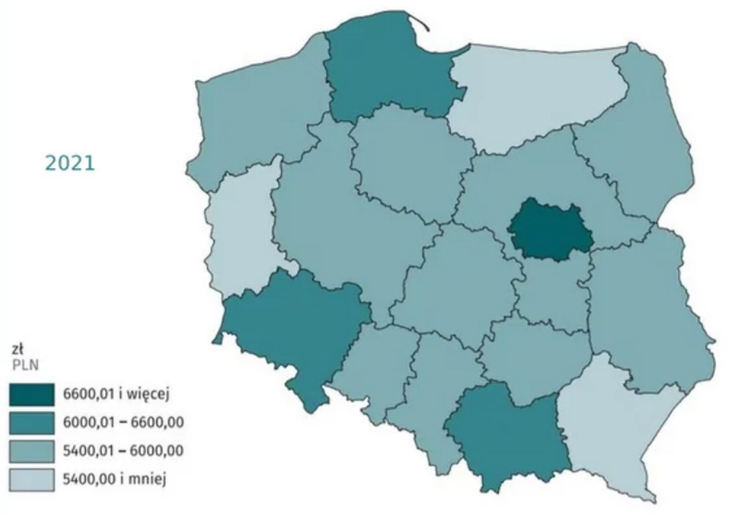Najwyższe płace są w Warszawie. Tu średnia pensja wynosi 7 405 zł 34 gr brutto. Na najniższe zarobki może z kolei liczyć pracownik z województwa warmińsko-mazurskiego, gdzie z przeciętną pensja to 5 309 zł i 60 gr. Niewiele więcej jest na Podkarpaciu – 5 310 zł i 65 groszy. To też pokazuje, że różnica między regionami z końca tabeli maleje. W 2020 r. wynosiła 70 zł a obecnie jest to niewiele ponad 1 złotówkę.