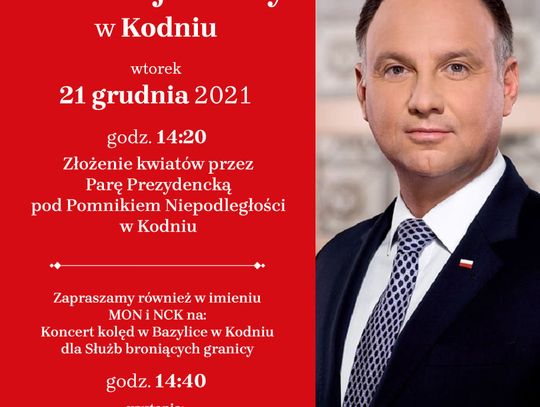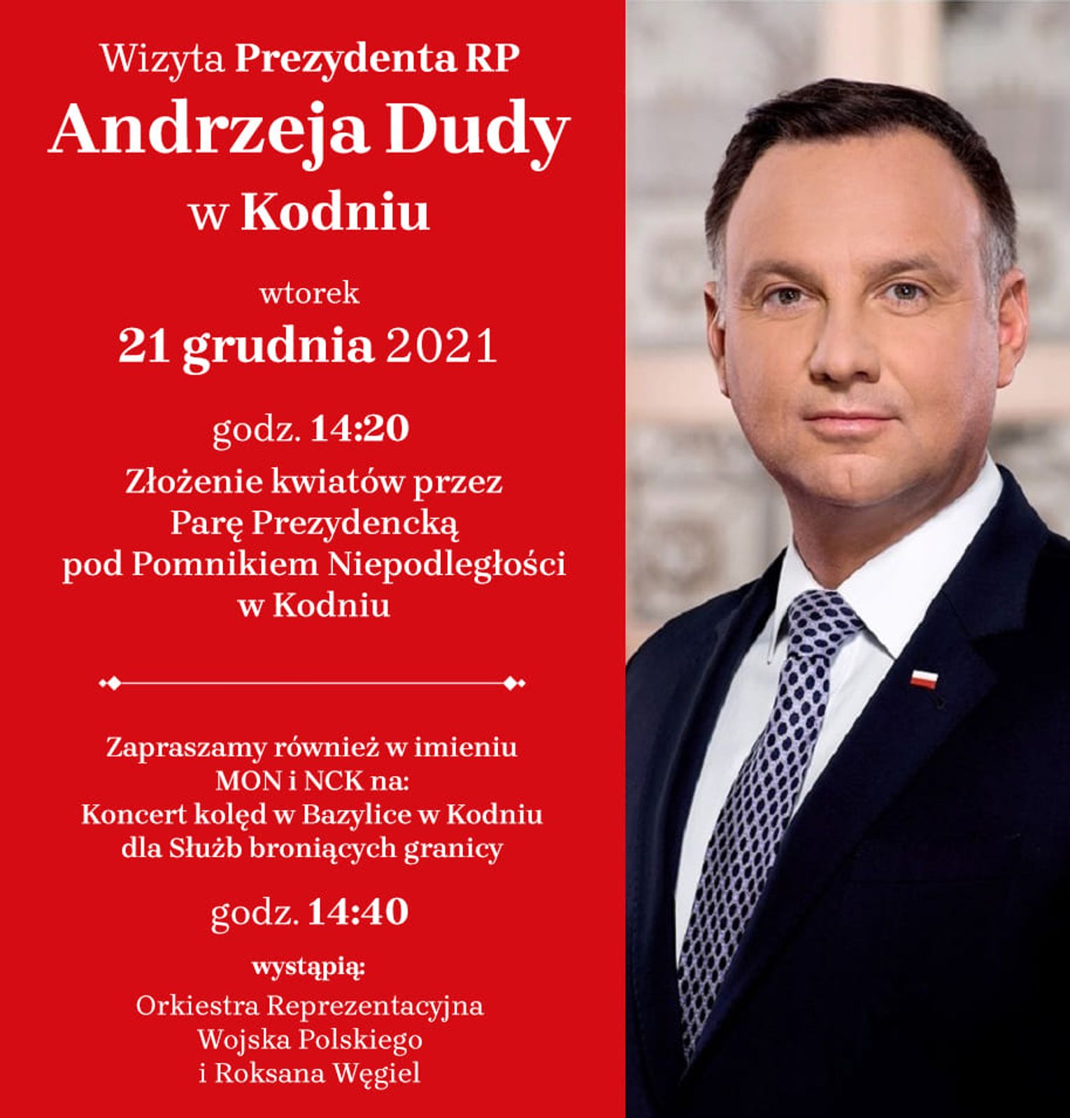 W planie wizyty Andrzeja i Agaty Dudy, która będzie miała miejsce 21 grudnia, jest spotkanie wigilijne z żołnierzami i funkcjonariuszami służącymi na polsko-białoruskiej granicy. Kolejno para prezydencka o godz. 14.20 złoży kwiaty przed pomnikiem Niepodległości w Kodniu. Następnie odbędzie się koncert kolęd w kodeńskiej bazylice przygotowany specjalnie żołnierzom i funkcjonariuszom służącym na granicy. W czasie uroczystości wystąpi Orkiestra Reprezentacyjna Wojska Polskiego oraz Roksana Węgiel – Roxie. Transmisję koncertu będzie można również obejrzeć na telebimie przed bazyliką.
