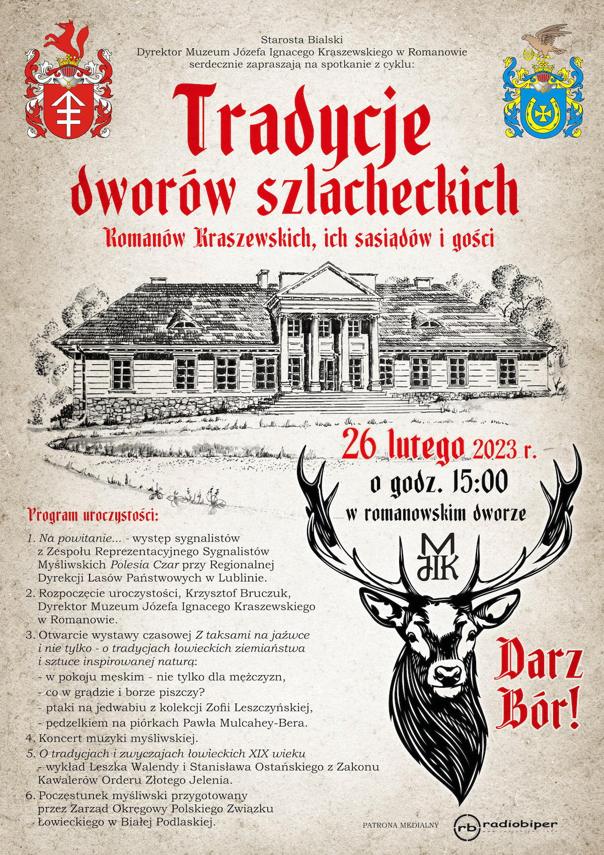 Na spotkanie z cyklu ”Tradycje dworów szlacheckich Romanów Kraszewskich, ich sąsiadów i gości" zapraszają starosta bialski i dyrektor Muzeum im. J.I. Kraszewskiego w Romanowie