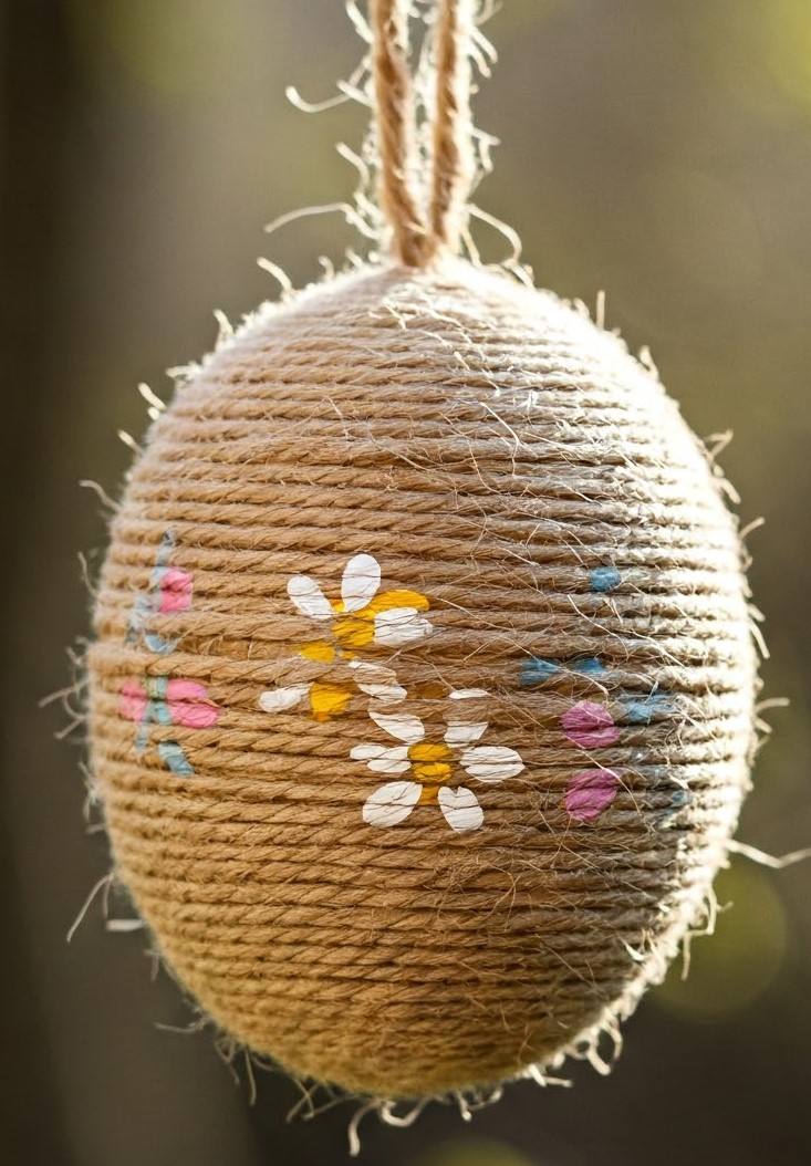 Kolejną propozycją na wielkanocny stół lub do koszyczka ze święconką jest pisanka w sznurkowym ubranku. Aby ją wykonać, potrzebujemy balon (najlepiej w kształcie jajka lub okrągły), sznurek jutowy (grubość według preferencji), klej PVA (wikol), pędzel, nożyczki.