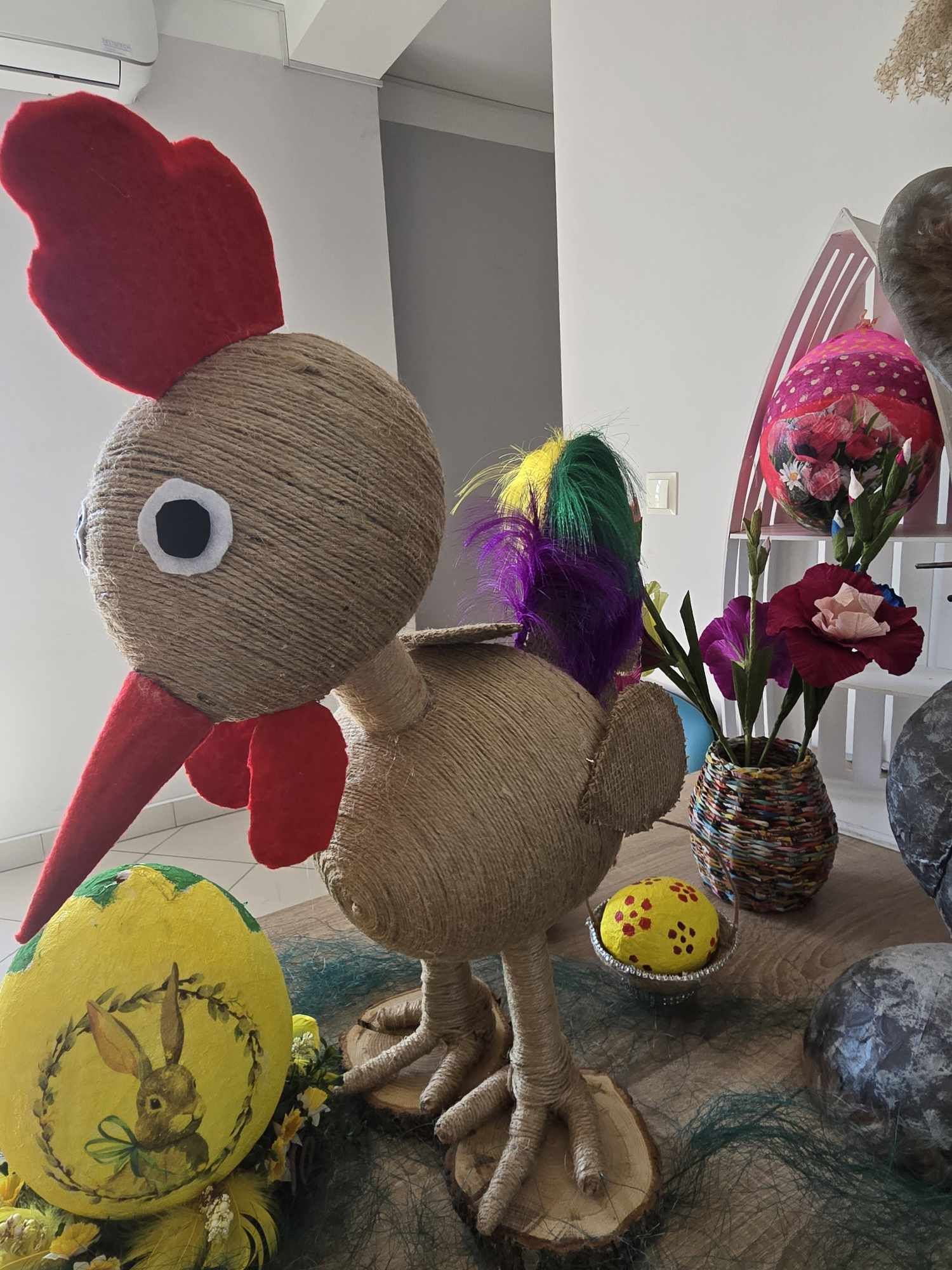 – Aby go przygotować musimy mieć balon, gazety, klej, nożyczki, flamastry. Zaczynamy od napompowania balonu i zawiązania końcówki. Następnie obklejamy go gazetą, podobnie jak w przypadku poprzednich dekoracji. Czekamy, aż całość wyschnie i obklejamy koguta sznurkiem jutowym. Potem wycinamy z papieru oczy i je przyklejamy. Rolkę po ręczniku papierowym wykorzystujemy do zrobienia nóg, filc do zrobienia pazurków i pióropusza, a satynową wstążkę do wykonania ogona – opowiadają pacjenci.