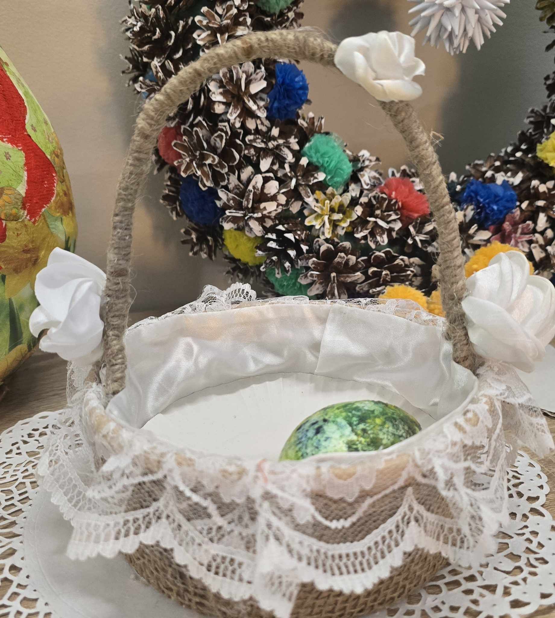 Koszyczek wykonujemy z pudełka po śmietanie i sznurka jutowego. Potrzebujemy też klej PVA (wikol) lub klej na gorąco, nożyczki, sztywny karton, ewentualnie do dekoracji koronkę, tasiemkę, drewniane elementy, sztuczne kwiaty. Rozpoczynamy od umycia i osuszenia pudełka po śmietanie. Od jego wielkości będzie zależała wielkość koszyczka. Dno pudełka usztywniamy sztywnym kartonem lub dyktą. Do brzegów koszyczka przyklejamy klejem na gorąco siatkę lub sznurek jutowy. Nakładamy klej na niewielki odcinek bocznej ścianki pudełka (od dołu do góry). Przyklejamy koniec sznurka do dolnej krawędzi i zaczynamy owijać sznurek wokół pudełka, warstwa po warstwie. Staramy się, aby kolejne owinięcia sznurka ściśle do siebie przylegały. Kontynuujemy, nakładając klej partiami i owijając sznurek, aż cała zewnętrzna powierzchnia pudełka będzie pokryta. Aby wykonać rączkę, formujemy z grubego drutu półokrąg. Przykładamy końce drutu do bocznych ścianek pudełka, wewnątrz. Mocujemy je mocno taśmą klejącą. Następnie owijamy drut sznurkiem jutowym, przyklejając go na bieżąco, aby ukryć drut i wzmocnić uchwyt. Na koniec koszyk dekorujemy, np. ręcznie wykonanymi kwiatuszkami, koronką lub innymi elementami – wyjaśniają seniorzy.