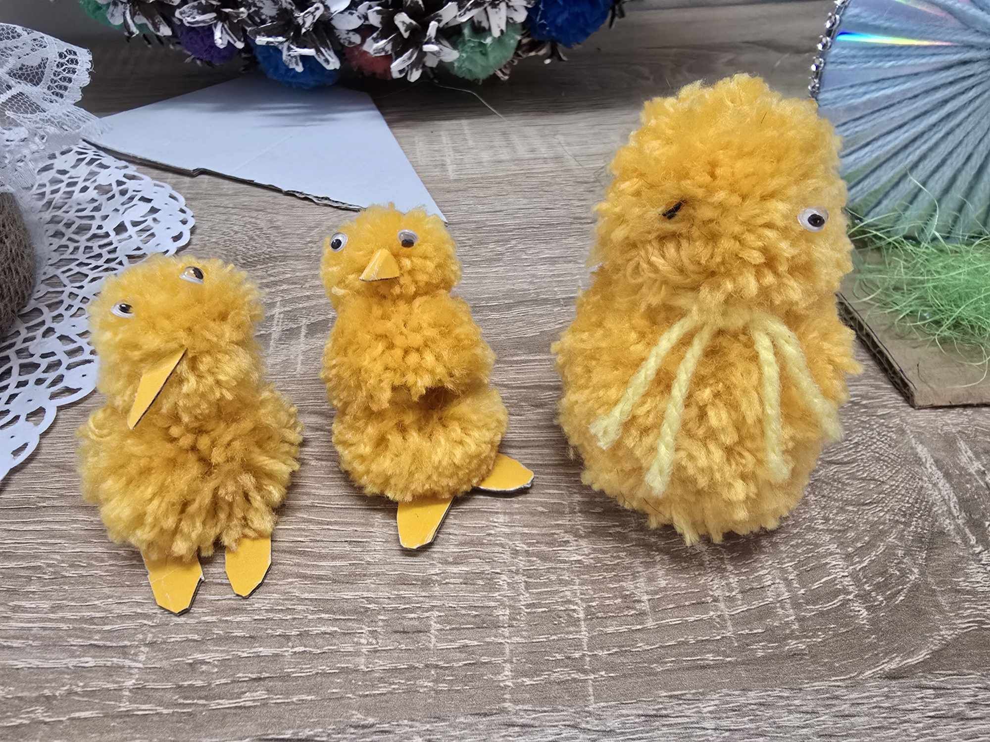 Stroik wykonujemy z włóczki, filcu, bazi, drewnianej kuleczki. – Zaczynamy od ptaszka. Owijamy włóczkę wielokrotnie wokół dwóch lub trzech palców dłoni. Im więcej owinięć, tym grubszy będzie ptaszek. Związujemy środek. Ostrożnie zsuwamy owiniętą włóczkę z palców. Przewiązujemy mocno w środku kawałkiem włóczki i zawiązujemy supeł. Aby uformować głowę i ogon, odmierzamy około 1/3 długości z jednej strony pęczka włóczki i mocno przewiązujemy ją, tworząc głowę. Pozostała część będzie korpusem i ogonem. Aby wykonać ogon, rozcinamy pętlę włóczki na końcu ogona i przycinamy, aby nadać mu kształt. Potem przyklejamy koraliki lub guziki jako oczy oraz mały trójkąt z filcu lub papieru jako dziób. Możemy przywiązać lub przykleić małe pęczki włóczki po bokach korpusu jako skrzydełka. Taki kurczaczek może ozdobić koszyczek wielkanocny.