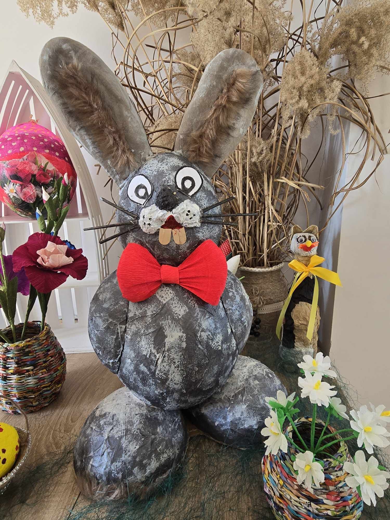 Podobnie wykonamy wielkanocnego zająca. Aby go zrobić, będziemy potrzebować trzy balony, stare gazety (świetnie sprawdzi się Słowo Podlasia), klej do decoupage lub z mąki i wody, farby akrylowe, gąbkę, nożyczki, sznurek, guziki, włóczkę.