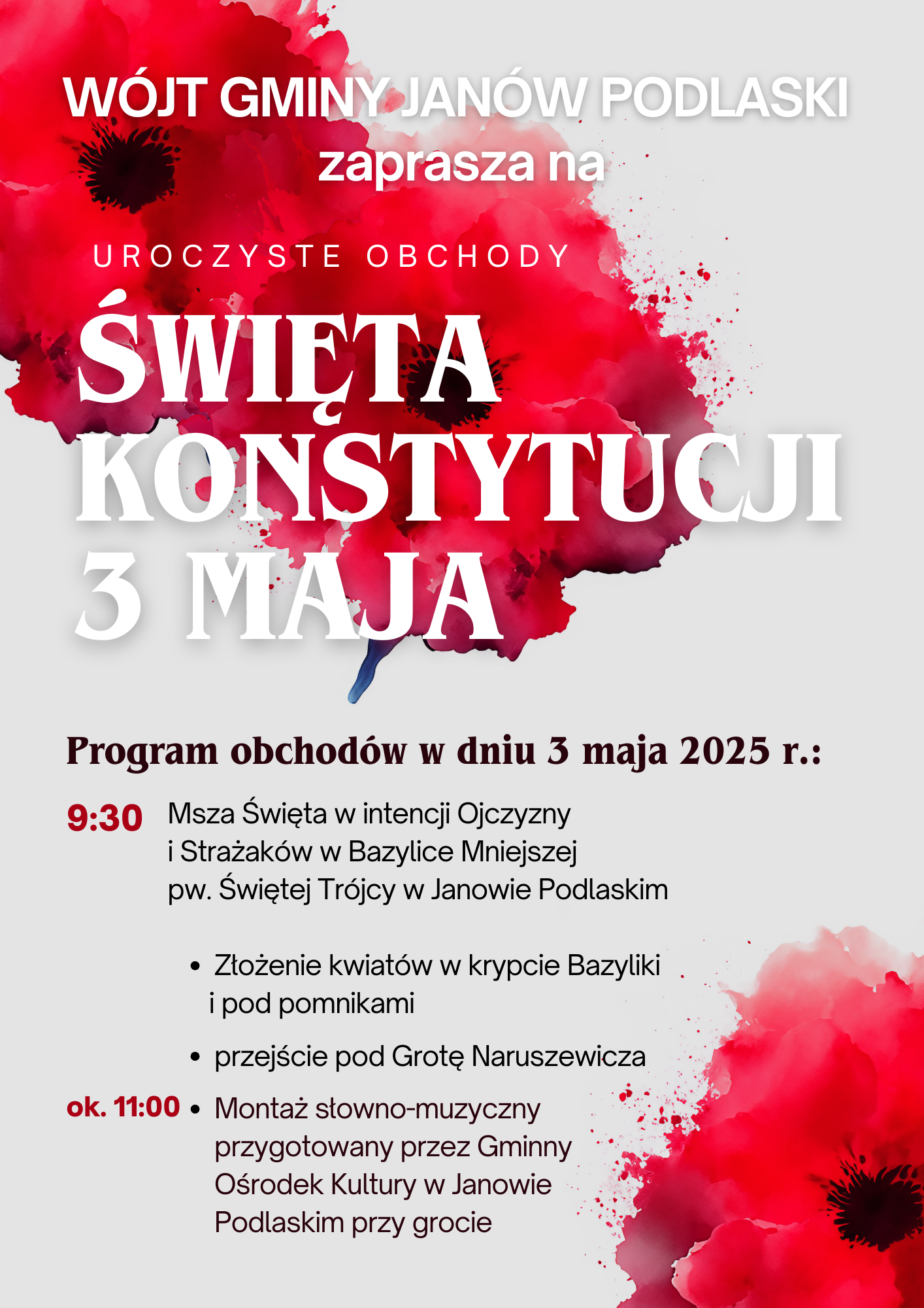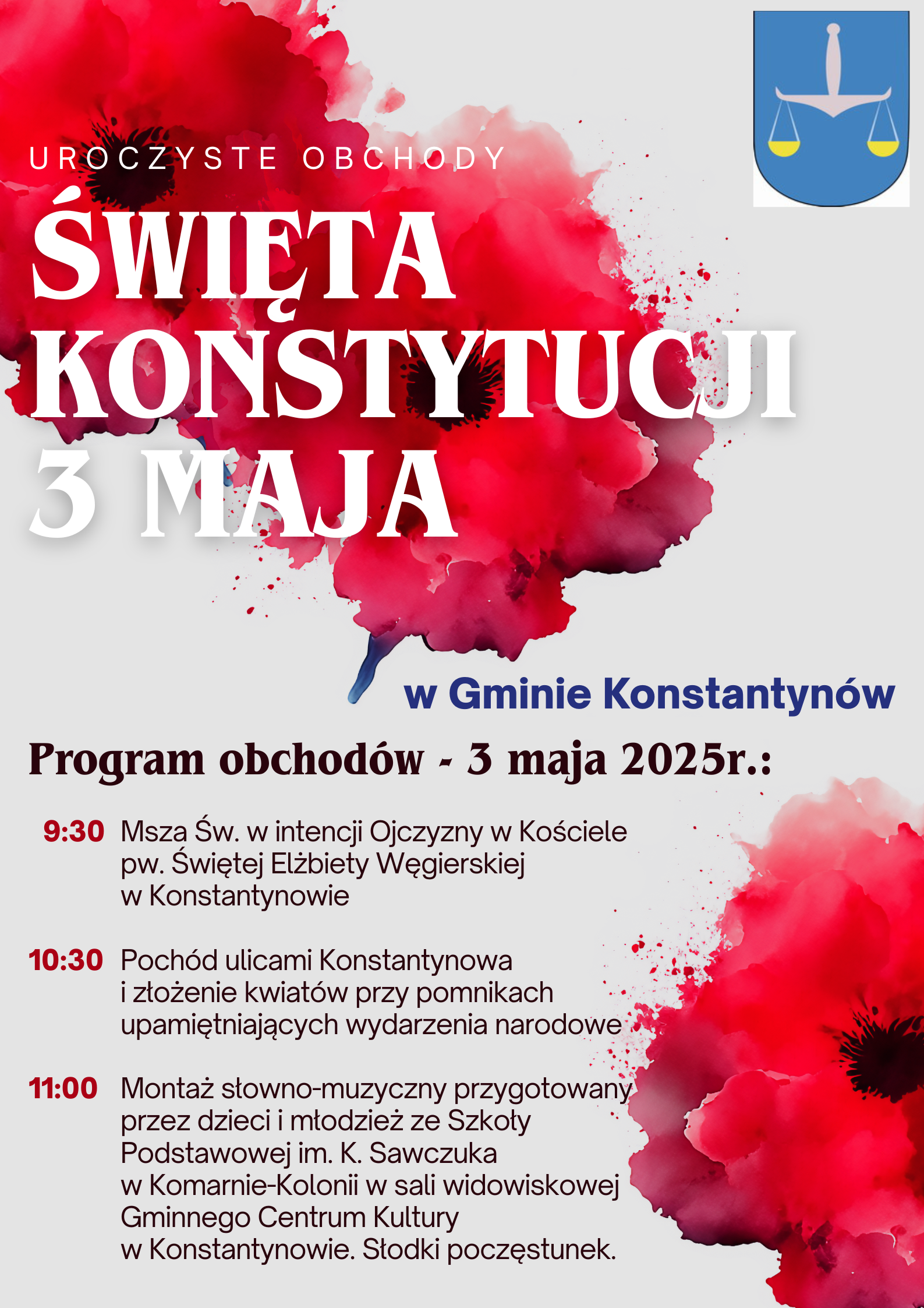 3 maja, wójt gminy Konstantynów zaprasza na uroczyste obchody święta Konstytucji 3 Maja w Konstantynowie. Uroczystości rozpoczną się o godzinie 9:30 mszą świętą w intencji ojczyzny w kościele pw. Świętej Elżbiety Węgierskiej w Konstantynowie. Po mszy, uczestnicy obchodów udadzą się na złożenie kwiatów, przy pomnikach upamiętniających wydarzenia narodowe.