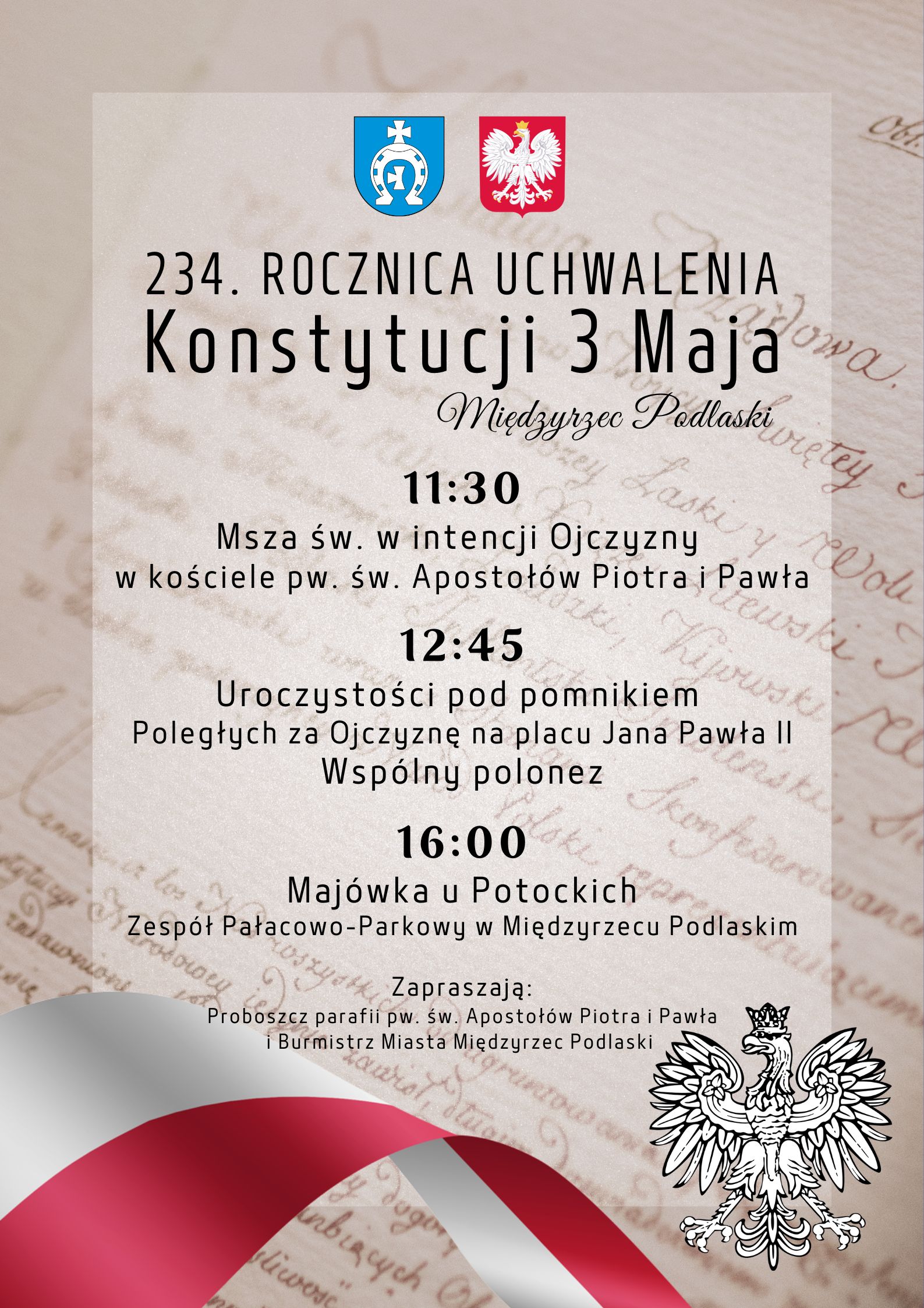 W Międzyrzecu Podlaskim obchody rozpoczną się 3 maja o godzinie 11:30, kiedy to w kościele pw. Świętych Apostołów Piotra i Pawła odprawiona zostanie uroczysta msza święta w intencji ojczyzny.