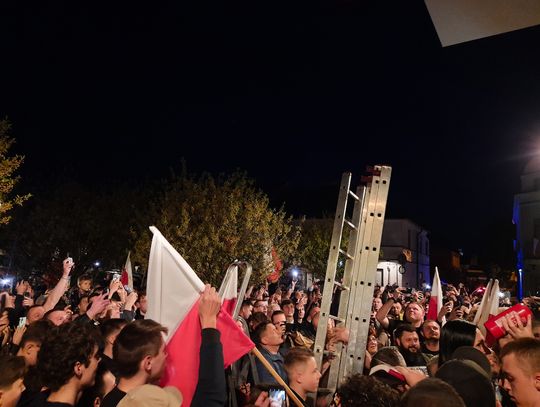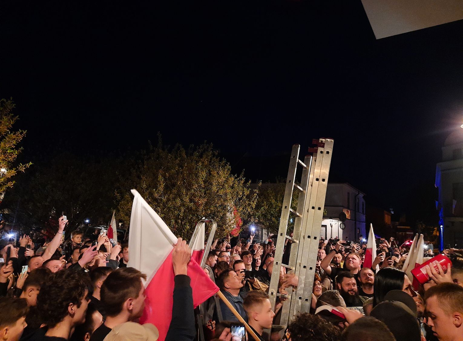 Doniesioną drugą, już z wystarczającą ilością stopni, by z chodnika sięgnęła nad wejście urzędu. Między ciasno ściśniętych ludzi wkroczyli funkcjonariusze z tarczami i w umundurowaniu przeciwuderzeniowym. Podczas szarpaniny z policją tłum skandował imię Grzegorza Brauna, śpiewał hymn państwowy i „Rotę”.