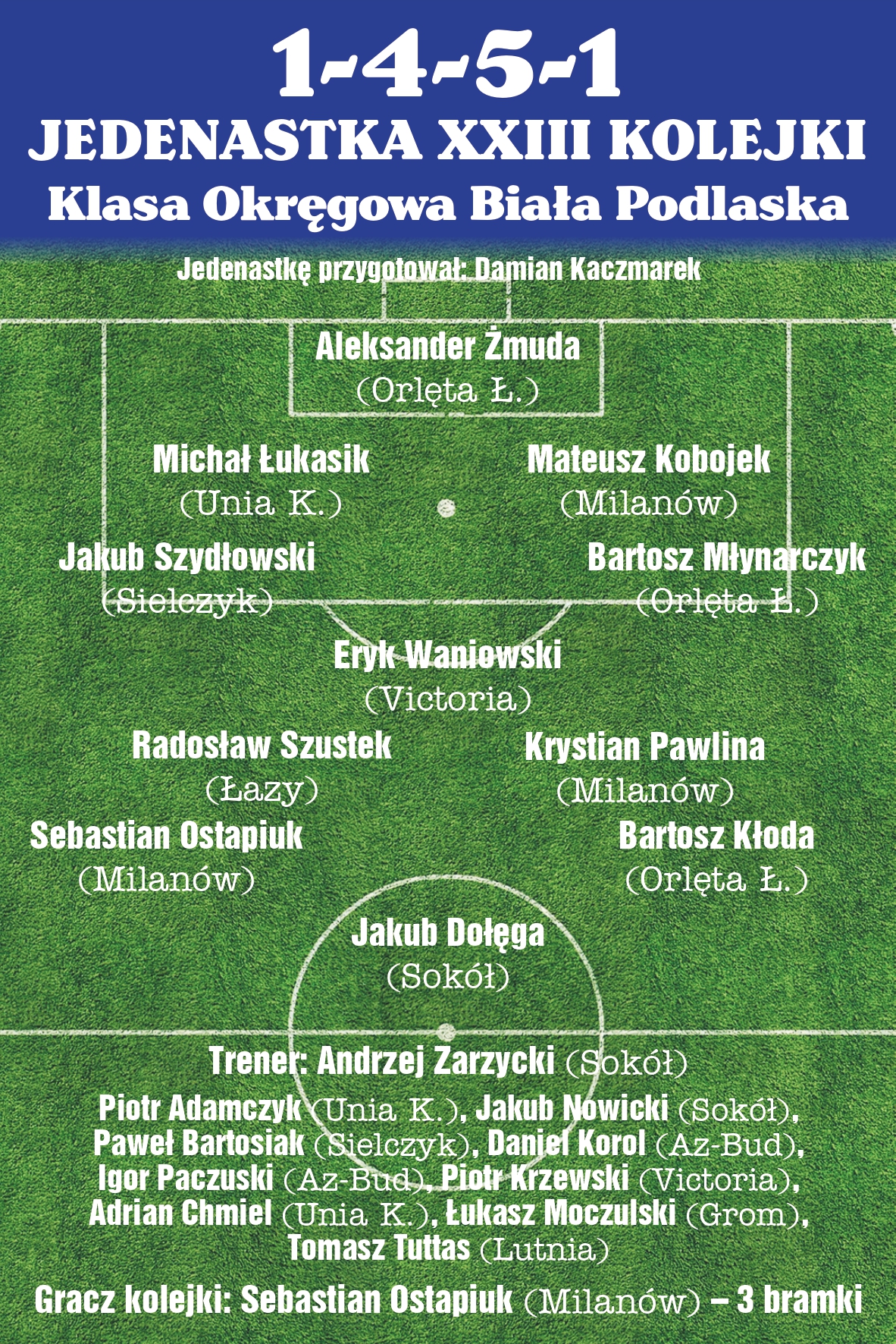Jedenastka 23.kolejki 4-5-1: BR: Aleksander Żmuda (Orlęta Ł. ), LO: Bartosz Młynarczyk (Orlęta Ł.), LŚO: Mateusz Kobojek (Milanów), PŚO: Michał Łukasik (Unia K.), PO: Jakub Szydłowski (Sielczyk), ŚPD: Eryk Waniowski (Victoria), LŚP: Krystian Pawlina (Milanów), PŚP: Radosław Szustek (Łazy), LP: Bartosz Kłoda (Orlęta Ł), PP: Sebastian Ostapiuk (Milanów), N: Jakub Dołęga (Sokół), ŁAWKA REZERWOWYCH: BR: Piotr Adamczyk (Unia K.), OB: Jakub Nowicki (Sokół), POM: Paweł Bartosiak (Sielczyk), POM: Daniel Korol (Az-Bud), POM: Igor Paczuski (Az-Bud), POM: Piotr Krzewski (Victoria), POM: Adrian Chmiel (Unia K.), POM: Łukasz Moczulski (Grom), N: Tomasz Tuttas (Lutnia). TRENER: Andrzej Zarzycki. GRACZ KOLEJKI: Sebastian Ostapiuk (Milanów) – 3 bramki.