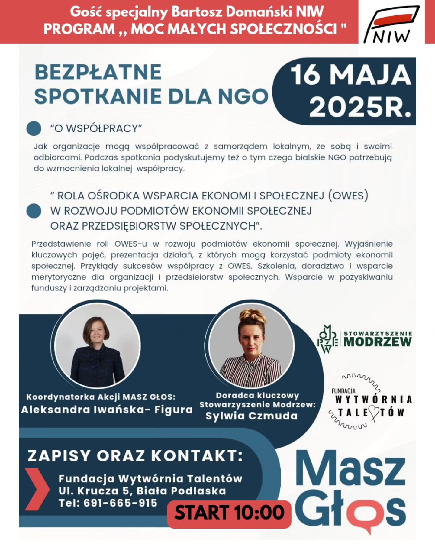 Gościem wydarzenia będzie Bartosz Domański, przedstawiciel NIW, który zaprezentuje program „Moc Małych Społeczności” - inicjatywę skierowaną do organizacji działających lokalnie, tworzonych z pasji i potrzeby oddolnego zmieniania rzeczywistości. Uczestnicy spotkania dowiedzą się, jak przygotować się do udziału w programie, z jakich form wsparcia będzie można skorzystać oraz o co warto pytać już na etapie planowania działań. Spotkanie odbędzie się 16 maja w siedzibie Fundacji Wytwórnia Talentów przy ul. Kruczej 5 w Białej Podlaskiej.