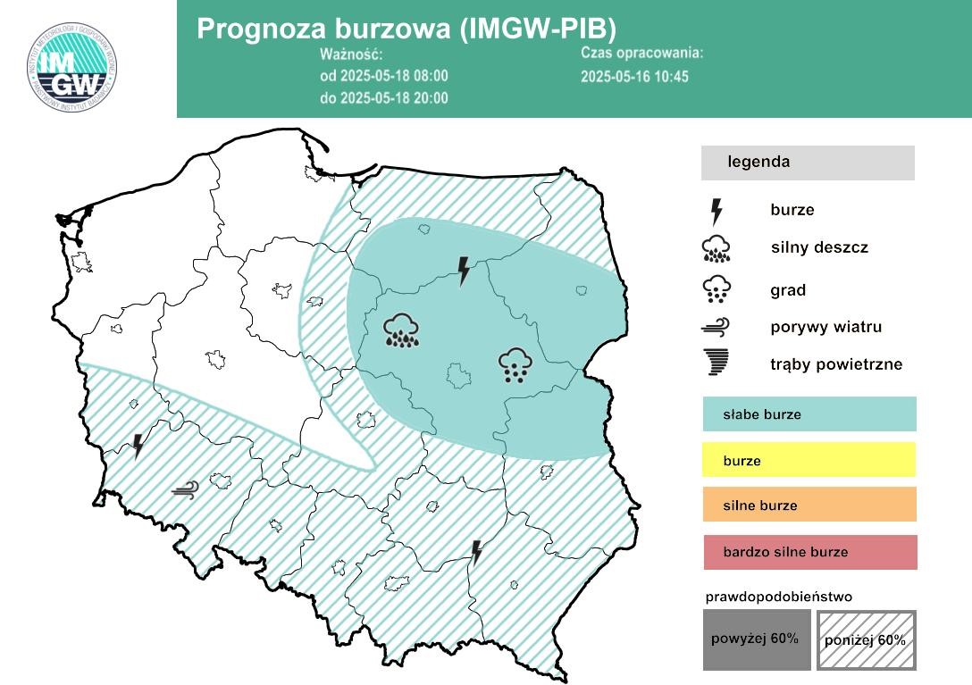 W niedzielę, 18 maja rano termometry wskażą 6 stopni Celsjusza. W dzień zachmurzenie duże z większymi przejaśnieniami. Przelotne opady deszczu. Możliwe również burze. Temperatura maksymalna do 11°C. Wiatr słaby i umiarkowany, okresami szczególnie podczas burz, porywisty. Wiatr o średniej sile do 10 km/h, w porywach do 45 km/h. Ciśnienie do 1008 hPa. Wieczorem temperatura wyniesie do 5 stopni Celsjusza.