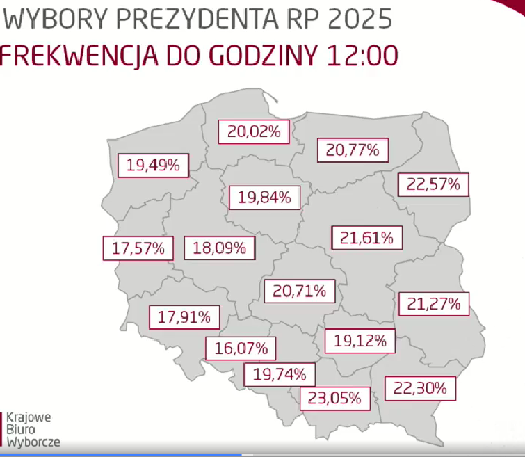 PKW poinformowała, że frekwencja do godz. 12 w kraju wynosiła 20,28 proc. w stosunku do liczby osób uprawnionych w wyborach . W województwie lubelskim zagłosowało 21,27 proc. w stosunku do uprawnionych osób.