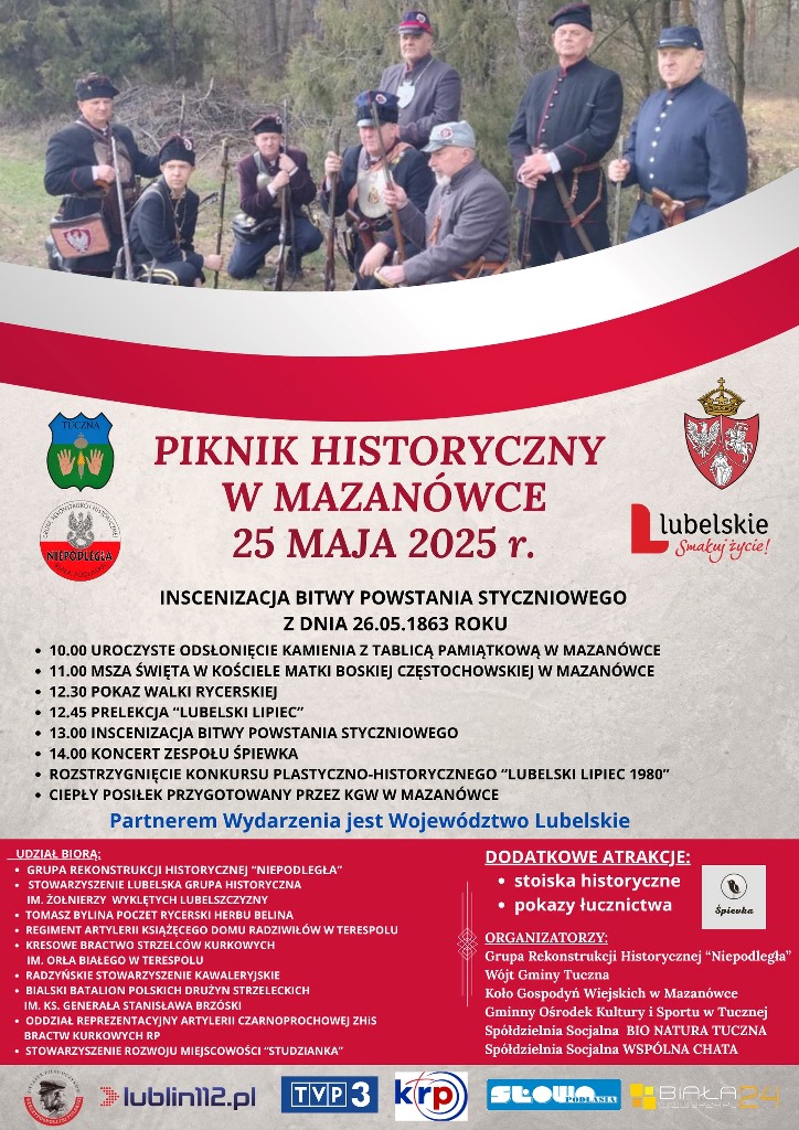 Wydarzenie odbędzie się 25 maja, a jego partnerem jest Województwo Lubelskie. Na miejscu nie zabraknie stoisk historycznych, pokazów łuczniczych i ciepłego poczęstunku przygotowanego przez Koło Gospodyń Wiejskich w Mazanówce.