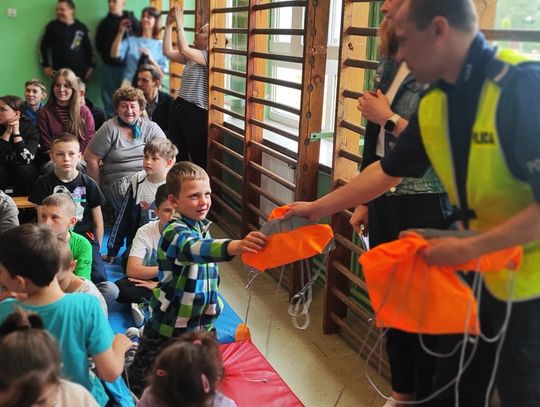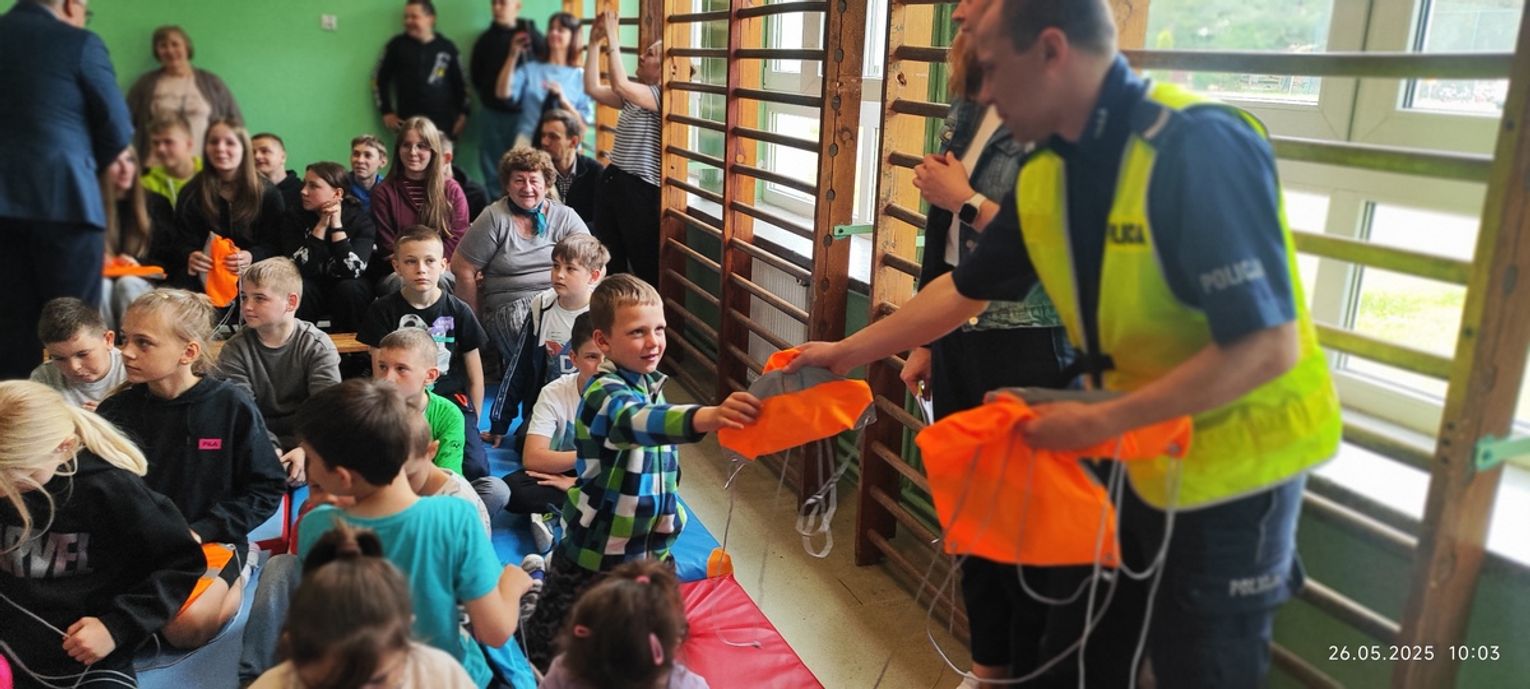 Podczas prelekcji dzieci poznały podstawowe zasady bezpiecznego przechodzenia przez jezdnię, poruszania się chodnikiem, poboczem i na rowerze. Policjanci przypomnieli również o konieczności noszenia odblasków, które znacząco zwiększają widoczność pieszego i mogą uratować życie. Każdy uczestnik spotkania otrzymał praktyczny zestaw elementów odblaskowych.