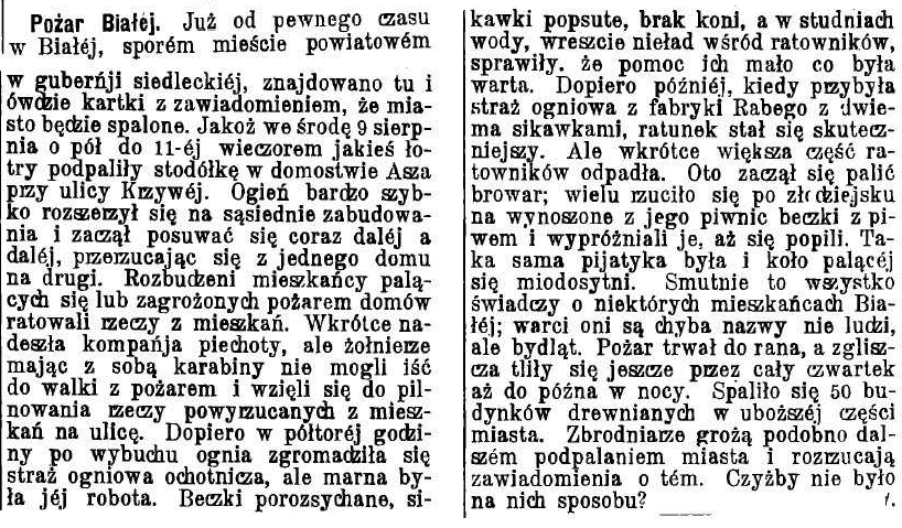 Pożar Białej. Już od pewnego czasu w Białej, sporém mieście powiatowém w gubernji siedleckiej, znajdowano tu i ówdzie kartki z zawiadomieniem, że miasto będzie spalone. Jakoż we środę 9 sierpnia o pół do 11-éj wieczorem jakieś łotry podpaliły stodółkę w domostwie Asza przy ulicy Krzywej.