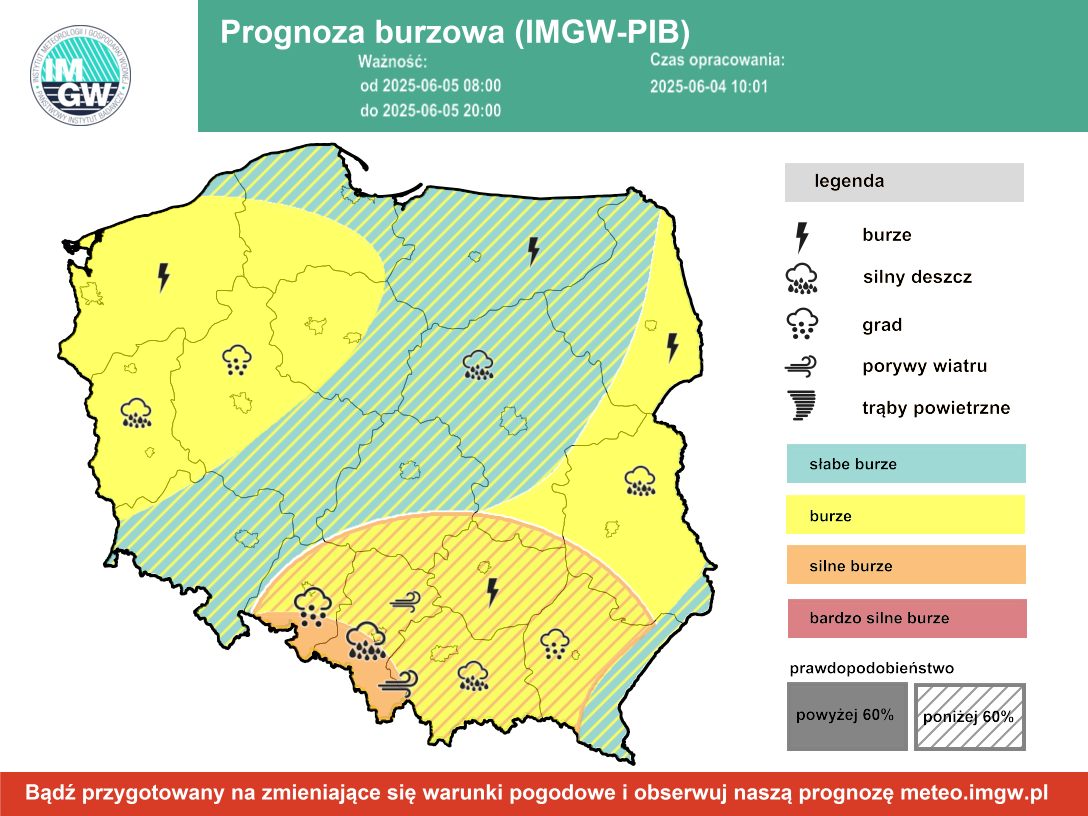 „Burze będą miejscami występować w całym kraju. Najwięcej burz pojawi się m.in. we wschodniej części kraju. Należy spodziewać się w czasie burz opadów rzędu 10-25 mm, porywów wiatru osiągających 70 km/h oraz opadów gradu o średnicy 2-3 cm. [...] Burze będą się pojawiać już od godzin rannych, przede wszystkim w obszarze. Będą one kontynuacją zjawisk burzowych, które będą przemieszczać się w nocy”.