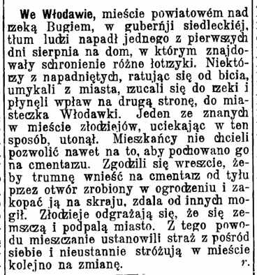 We Włodawie, mieście powiatowóm nad rzeką Bugiem, w guberńji siedleckiej, tłum ludzi napadł jednego z pierwszych dni sierpnia na dom, w którym znajdo wały schronienie różne łotrzyki. Niektórzy z napadniętych, ratując się od bicia, umykali z miasta, rzucali się do rzeki i płynęli wpław na drugą stronę, do miasteczka Włodawki. Jeden ze znanych w mieście złodziejów, uciekając w ten sposób, utonął. Mieszkańcy nie chcieli pozwolić nawet na to, aby pochowano go na cmentarzu. Zgodzili się wreszcie, że by trumnę wnieść na cmentarz od tyłu przez otwór zrobiony w ogrodzeniu i za kopać ją na skraju, zdała od innych mogił. Złodzieje odgrażają się, że się ze mszczą i podpalą miasto. Z tego powodu mieszczanie ustanowili straż z pośród siebie i nieustannie stróżują w mieście kolejno na zmianę.