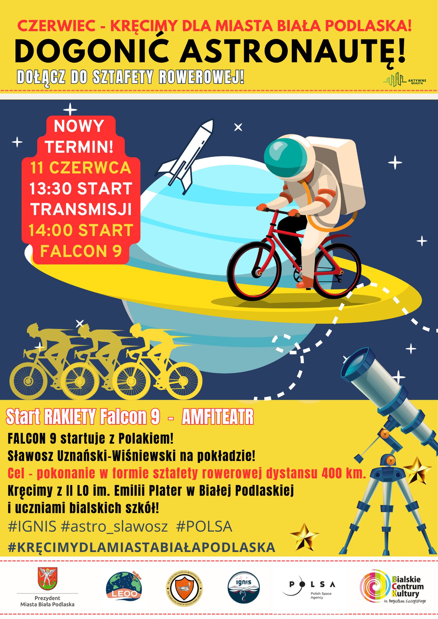 W aplikacji „Aktywne Miasta” rusza wyjątkowa sztafeta w ramach akcji "Dogonić astronautę". Zabawa startuje 11 czerwca. – Zadaniem uczestników będzie grupowe pokonanie, w ciągu 4 pierwszych dni od startu rakiety Falcon 9 z Polakiem na pokładzie, symbolicznego dystansu dowolnie wybraną dyscypliną sportu. Dystans to średnia wysokość orbity, po której Międzynarodowa Stacja Kosmiczna okrąża Ziemię, czyli 400 km. Liczy się łącznie pokonany dystans dowolnie rozłożony w czasie pierwszych czterech dni od startu rakiety – informuje miejski magistrat.
