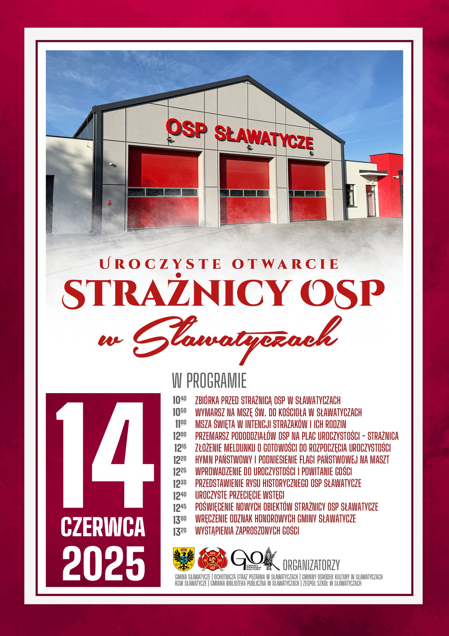 Część oficjalna obejmie również uroczyste przecięcie wstęgi o 12:40 oraz poświęcenie nowych obiektów strażnicy OSP Sławatycze o 12:45. O godzinie 13:00 nastąpi wręczenie odznak honorowych gminy Sławatycze, a wydarzenie zakończy się o 13:20 wystąpieniami zaproszonych gości.