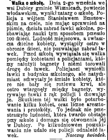 Przed szkołą wywiązała się walka pomiędzy kobietami a policjantami, którzy nałożyli bagnety i niemi torowali drogę do ławek. Policjanci wynieśli ławki z budynku szkolnego, ale natychmiast schwytały je śmiałe kobiety, które nie bały się rozlewu krwi, ale ostro wtargnęły między bagnety, wyrywając ławki z rąk policji i chowając je. Skutkiem téj walki było poturbowanie kilku kobiet, oraz liczne aresztowania i protokóły. To jednak nie przestraszyło ludności, która twardo obstaje przy szkole i domaga się otworzenia jej w Dubicy. Po kilkudniowém poszukiwaniu nie udało się policji odnaleźć ławek.