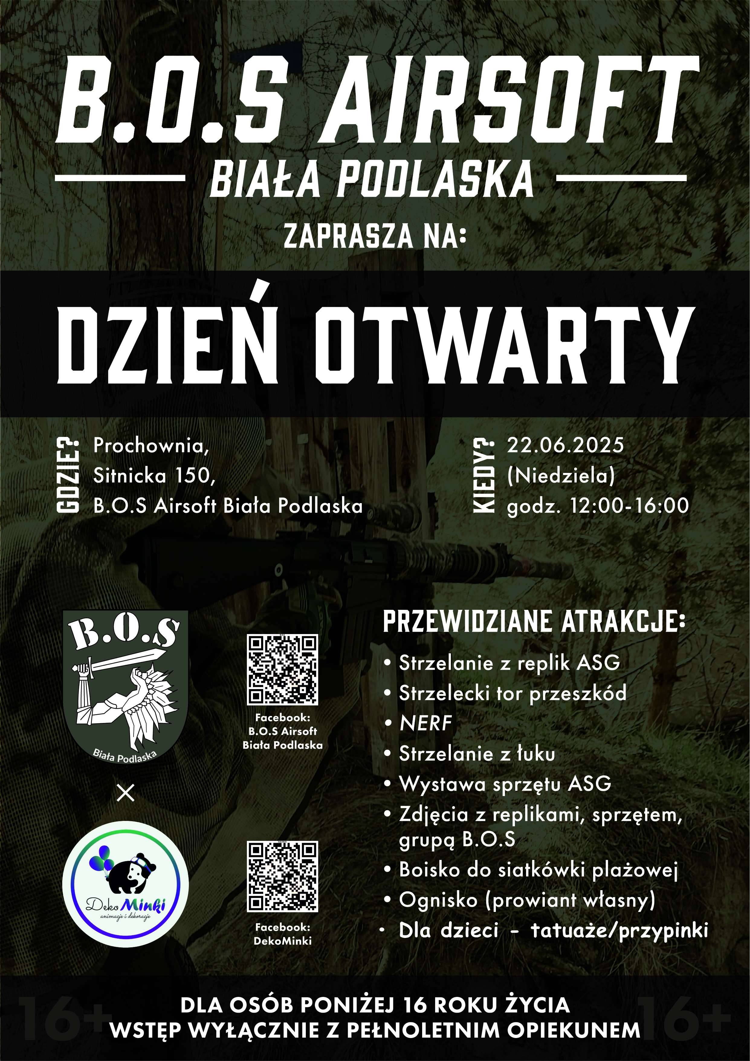 W niedzielę, 22 czerwca w godzinach od 12:00 do 16:00 grupa B.O.S Airsoft zaprasza na swój dzień otwarty. Wydarzenie odbędzie się na terenie tzw. prochowni przy ulicy Sitnickiej 150 w Białej Podlaskiej. To doskonała okazja, by z bliska zobaczyć, czym jest airsoft, poznać członków grupy i samodzielnie spróbować swoich sił w tej formie aktywności.
