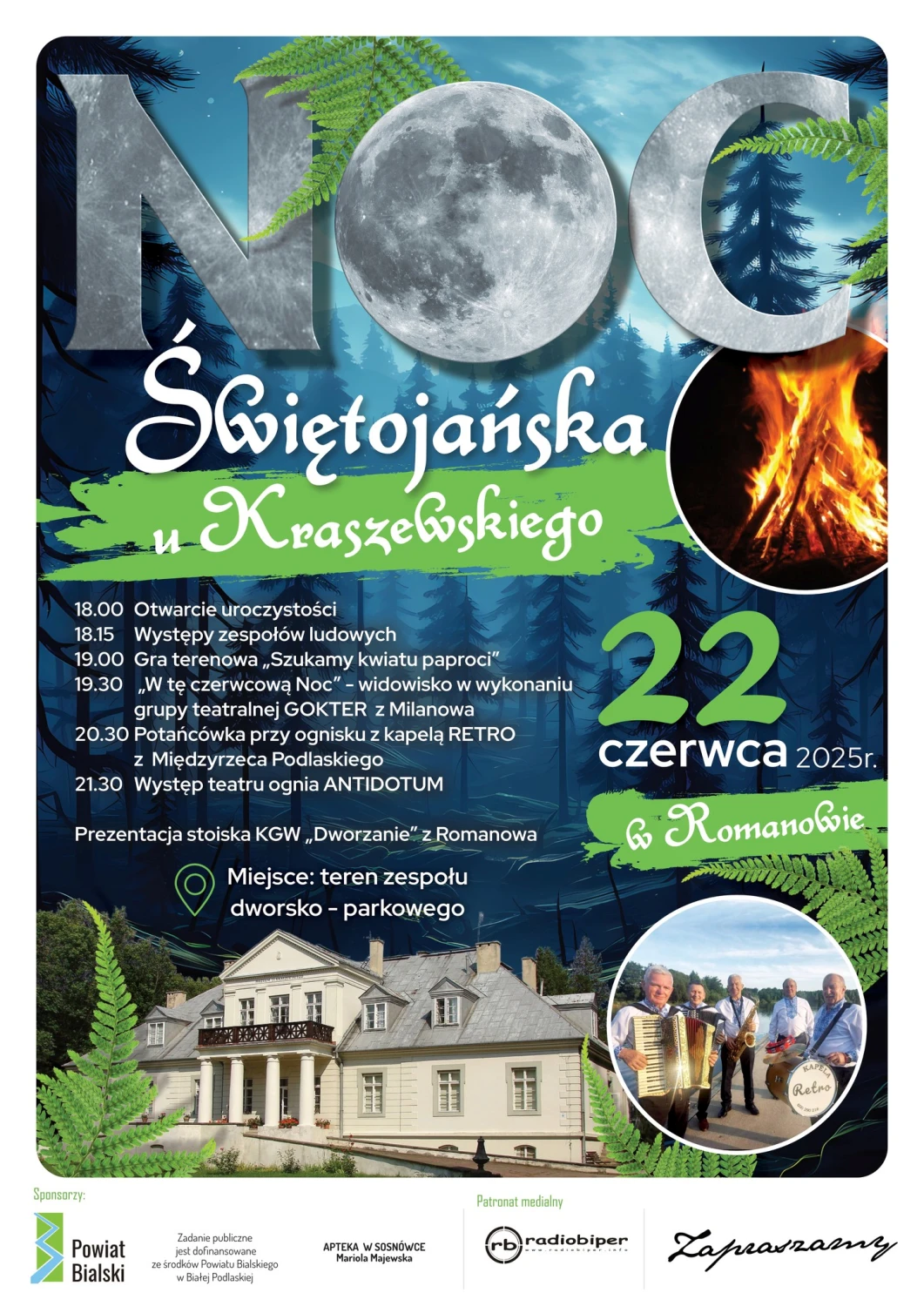 O godzinie 19.30 na scenie wystąpi grupa teatralna GOKTER z Milanowa, prezentując widowisko „W tę czerwcową noc”, które zabierze widzów w podróż przez tradycje i legendy nocy świętojańskiej. Następnie, o 20.30, przy ognisku rozpocznie się potańcówka z kapelą RETRO z Międzyrzeca Podlaskiego, która rozgrzeje atmosferę do czerwoności. Finał wieczoru zapowiada się równie spektakularnie – o 21.30 wystąpi teatr ognia ANTIDOTUM, który oczaruje publiczność ogniowymi popisami.