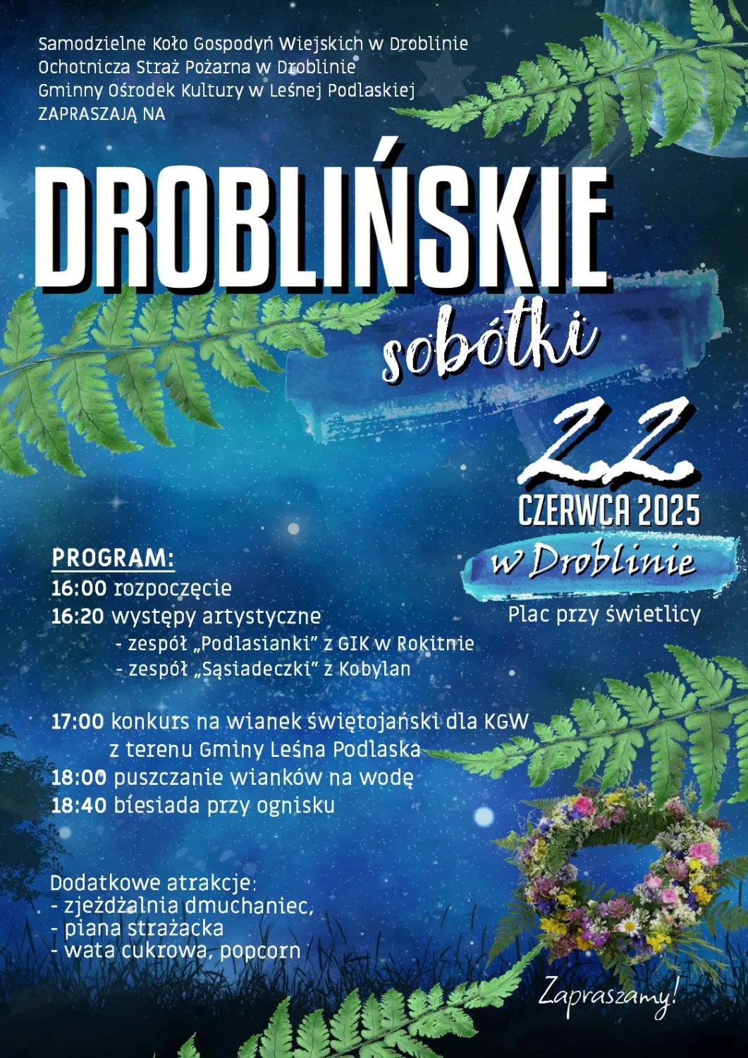 Droblińskie Sobótki już 22 czerwca. W programie wydarzenia znajdą się m.in. występy artystyczne lokalnych zespołów „Podlasianki” z Rokitna i „Sąsiadeczki” z Kobylan, konkurs na najpiękniejszy wianek świętojański przygotowany przez Koła Gospodyń Wiejskich z terenu gminy oraz rytualne puszczanie wianków na wodę. Zwieńczeniem wieczoru będzie biesiada przy ognisku – idealna okazja do wspólnego śpiewania i rozmów.