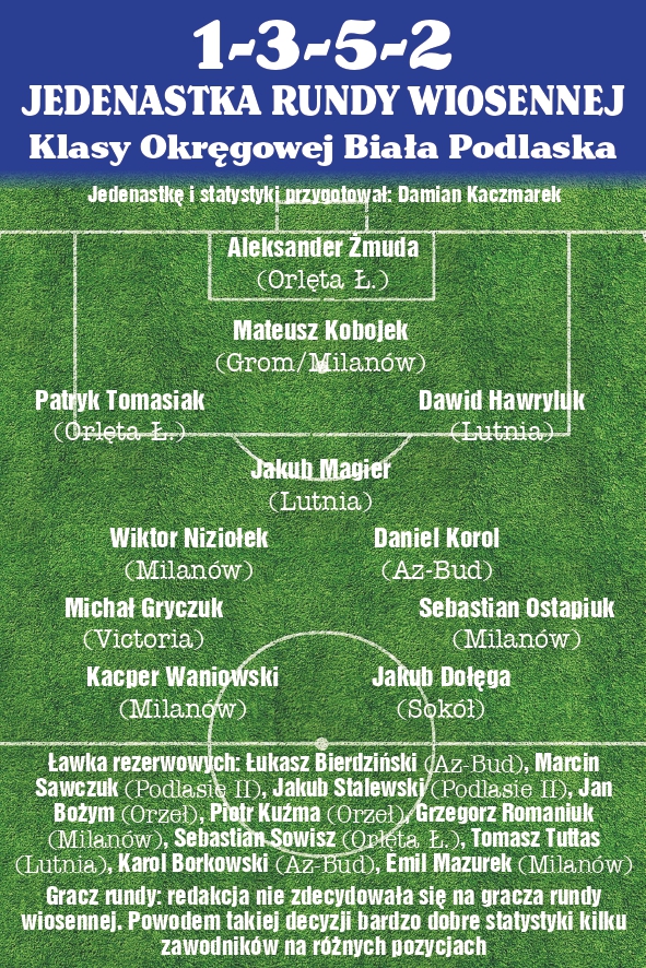 Przedstawiamy jedenastkę rundy wiosennej. Do niedzieli można głosować w naszym plebiscycie na piłkarza maja i czerwca w bialskopodlaskiej klasie okręgowej.
