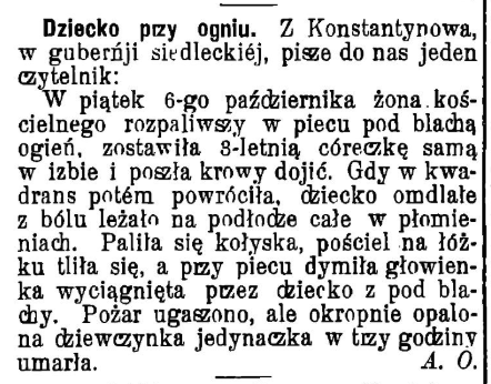 W piątek 6-go października żona kościelnego rozpaliwszy w piecu pod blachą ogień, zostawiła 3-letnią córeczkę samą w izbie i poszła krowy doić. Gdy w kwadrans potem powróciła, dziecko omdlałe z bólu leżało na podłodze całe w płomieniach. Paliła się kołyska, pościel na łóżku tliła się, a przy piecu dymiła głowienka wyciągnięta przez dziecko z pod blachy. Pożar ugaszono, ale okropnie opalona dziewczynka jedynaczka w trzy godziny umarła.