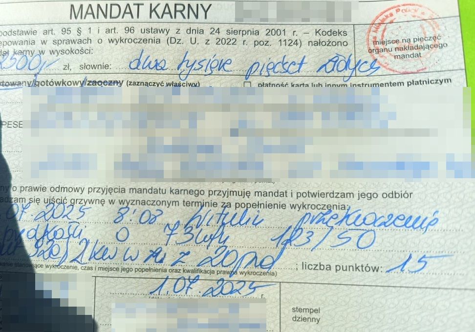 Za 123 km/h na liczniku policjanci wystawili mu mandat w wysokości 2500 złotych, a na jego koncie pojawiło się 15 punktów karnych. Kierowca pożegnał się też z prawem jazdy na trzy miesiące.