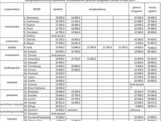 Wróćmy do dyrektorskich pensji. Szef WORD-u w Warszawie otrzymuje 19 200 zł co miesiąc i to najwięcej na Mazowszu, bo szefowie pozostałych, znajdujących się na tym terenie ośrodków, zarabiają ok. 5 tys. zł mniej.