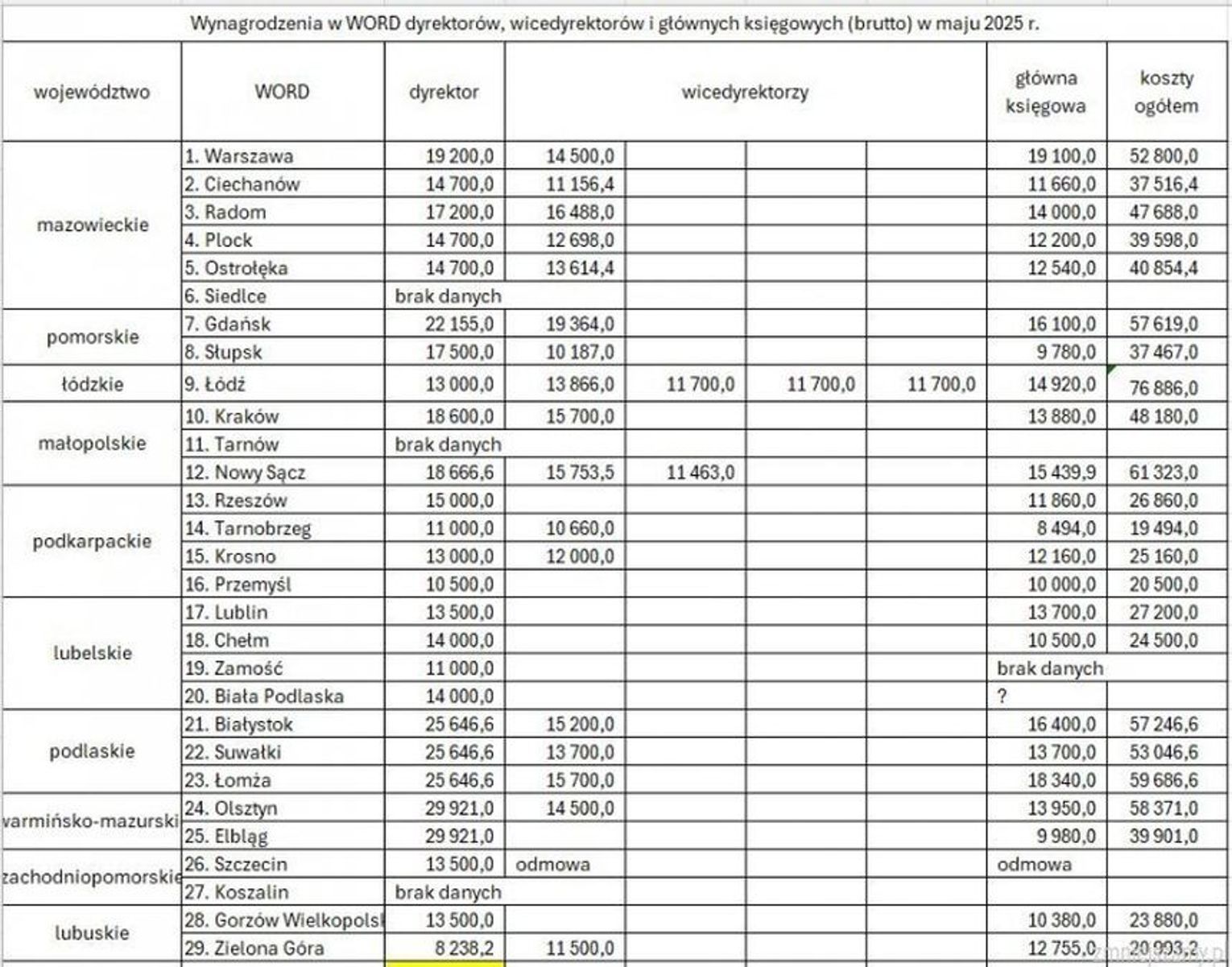 Z kolei najniższą pensję ma dyrektor WORD-u w Zielonej Górze. To tylko 8238 zł.
