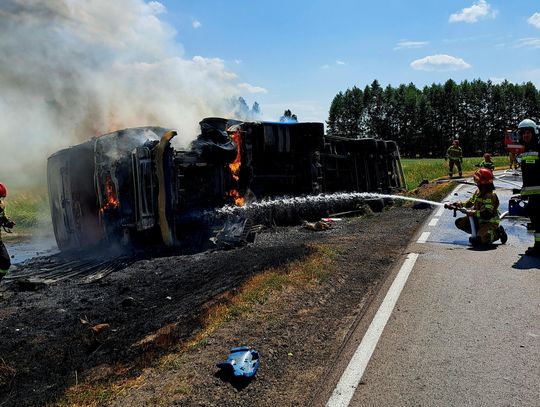 Ciężarówka stanęła w płomieniach i całkowicie spłonęła kabina pojazdu. Ogień częściowo objął również naczepę.
