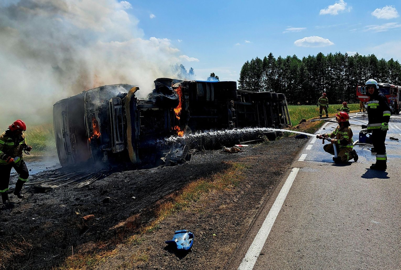 Na ten moment droga wojewódzka 811 na trasie Biała Podlaska-Konstantynów jest całkowicie zablokowana. Nad Hrudem widać gęste, ciemne kłęby dymu.