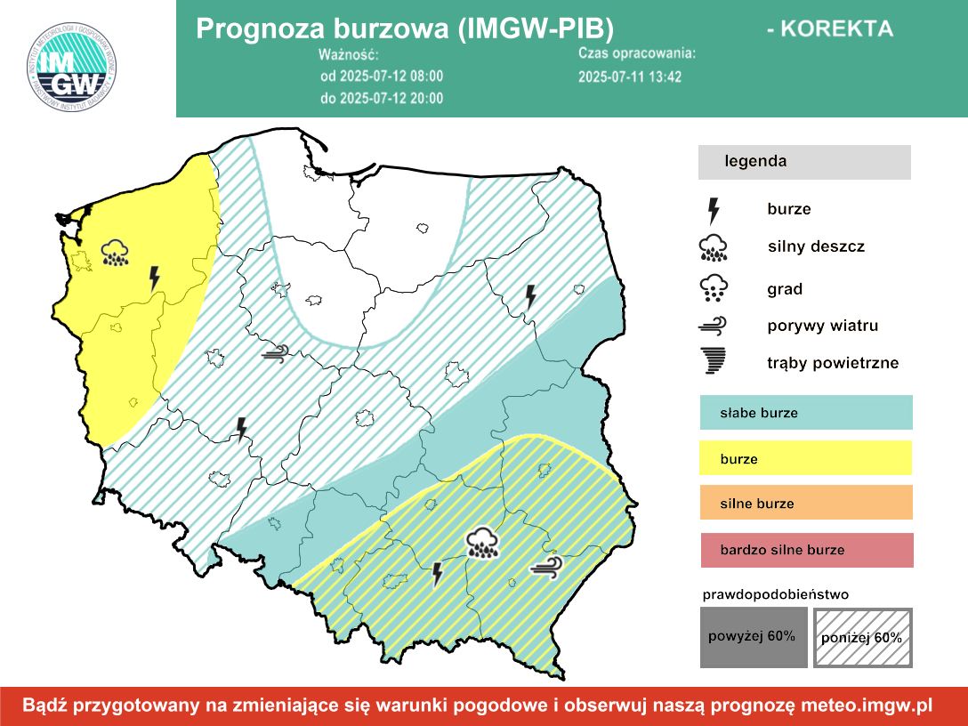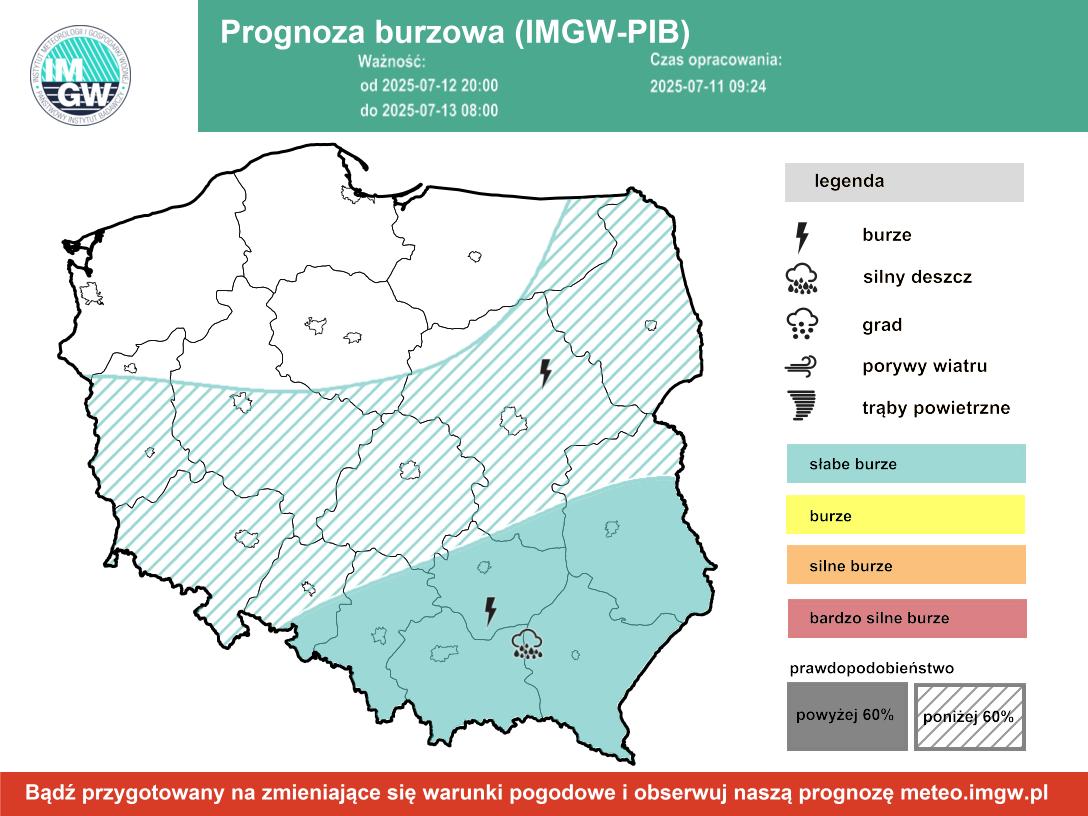 Popołudniu pogoda ponownie może się zmienić – prognozowane są przelotne opady i burze, które miejscami mogą mieć bardziej dynamiczny przebieg. Możliwy jest też niewielki grad. Sumy opadów punktowo mogą osiągać 20 mm, a wiatr w trakcie burz może osiągać porywy do 70 km/h.