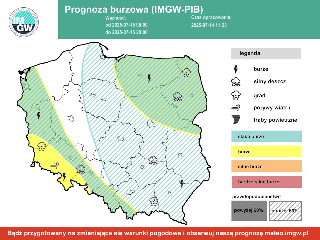 Zgodnie z prognozą IMGW, we wtorek 15 lipca na znacznej części Polski, w tym na wschodzie i północnym wschodzie, przewidywany jest rozwój licznych komórek burzowych. W naszym regionie mogą one występować w formie pojedynczych, ale intensywnych komórek konwekcyjnych. Główne zagrożenia to silne, krótkotrwałe opady deszczu – od 20 do nawet 35 mm – a także porywy wiatru sięgające 80 km/h. Lokalnie możliwe są także opady drobnego gradu.