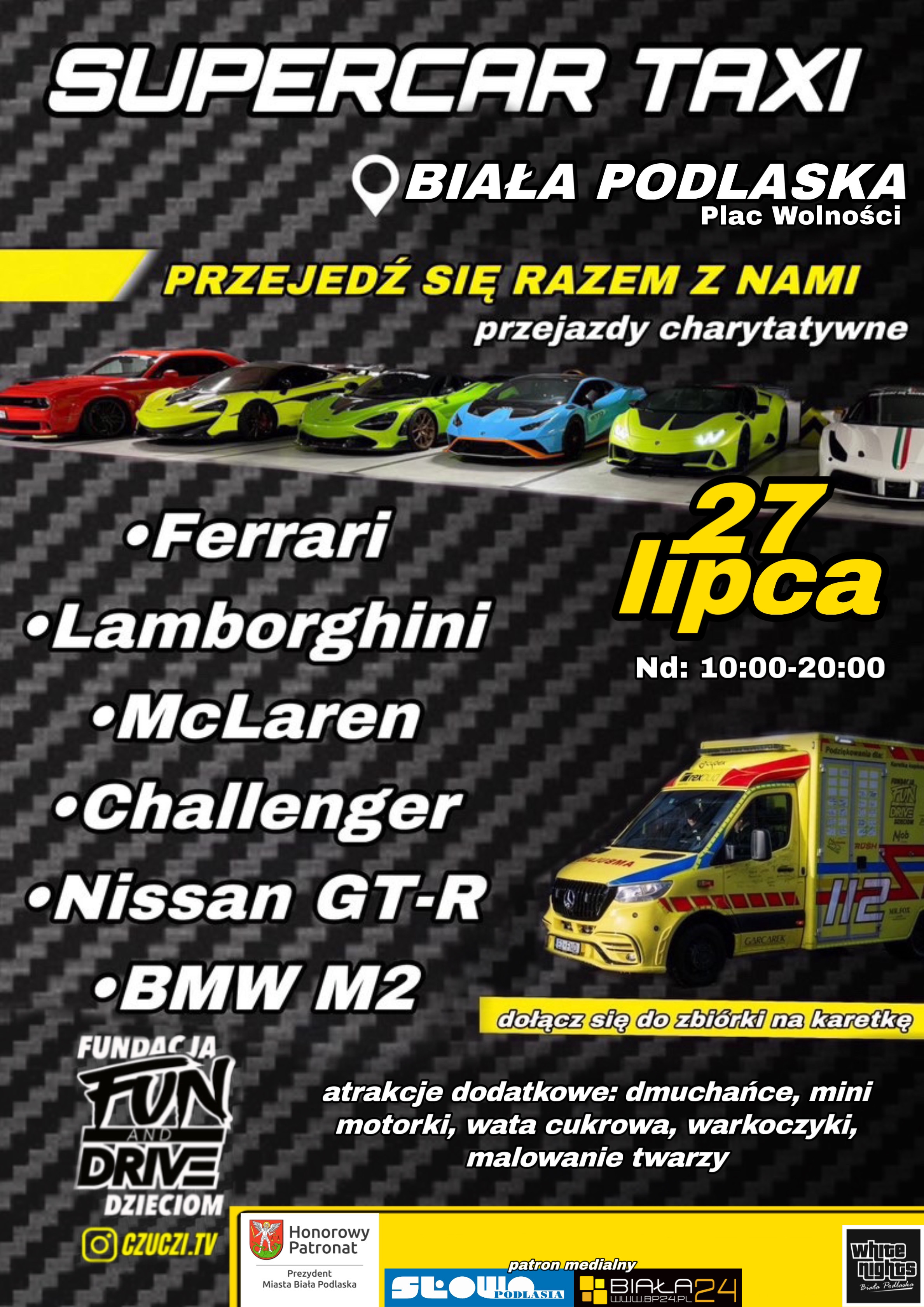 "Głównym punktem wydarzenia, który będzie realizowany przez cały czas jego trwania są przejazdy z nami jednym z samochodów, które powodują ciarki na ciele każdego maniaka motoryzacji. Co więcej, to auta są zmodyfikowane w taki sposób że są jeszcze mocniejsze i jeszcze piękniejsze, więc przyjdź i zobacz te dzieła sztuki. Oprócz przejażdżki, będziesz miał możliwość zasiąść za kierownicą i zrobić pamiątkowe zdjęcia. Trasy przejazdów dobraliśmy tak, aby dostarczyć Wam jak najwięcej emocji. Poczuj moc każdego z aut. Każdy znajdzie tutaj coś dla siebie. To co najistotniejsze - dzięki tym przejazdom i zdjęciom, wspierasz akcję Fundacji Fun and Drive dzieciom! " - czytamy na facebookowym profilu wydarzenia w Białej Podlaskiej.