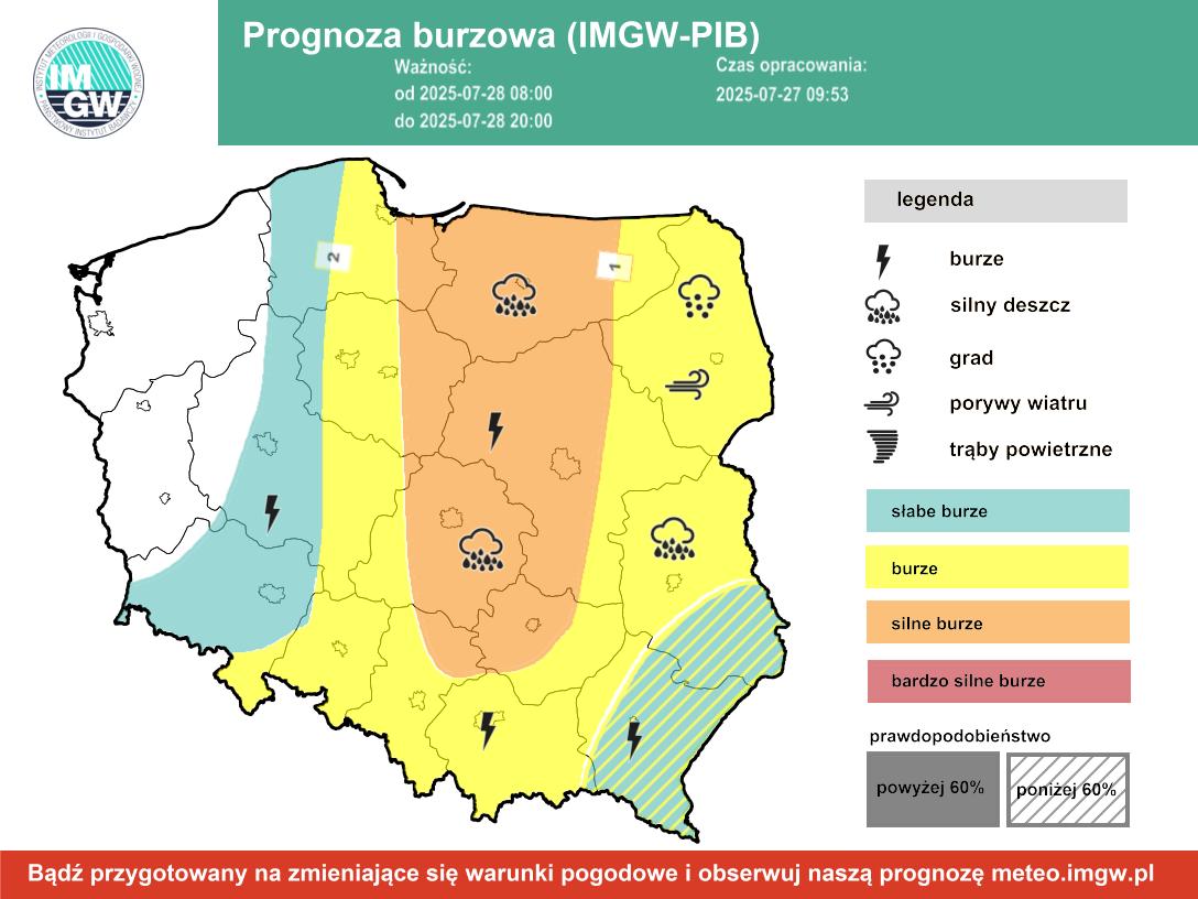 W dzień (28 lipca), od godzin przedpołudniowych, przewidywany jest rozwój konwekcji burzowej. Burzom będą torzyszyć ulewne opady – od 35 mm do nawet 55 mm, lokalnie możliwe są podtopienia i zalania. W czasie burz porywy wiatru mogą osiągać do 75 km/h, a punktowo możliwy jest opad gradu.
