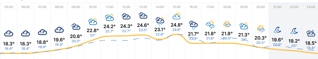 Temperatura maksymalna w ciągu dnia wyniesie od 21°C do 24°C. Wiatr umiarkowany, okresami porywisty, z kierunku północno-zachodniego. Ciśnienie atmosferyczne będzie wahać się wokół 1000 hPa.