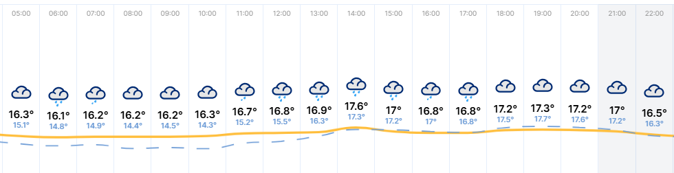 Temperatura przez cały dzień utrzyma się na stosunkowo niskim poziomie. O poranku termometry pokażą około 16°C, a w najcieplejszym momencie dnia nie więcej niż 17,5°C. Odczuwalna temperatura będzie niższa z powodu wysokiej wilgotności (powyżej 90 proc.) i umiarkowanego wiatru z kierunku północno-zachodniego. Ciśnienie od 1006 do 1010 hPa.