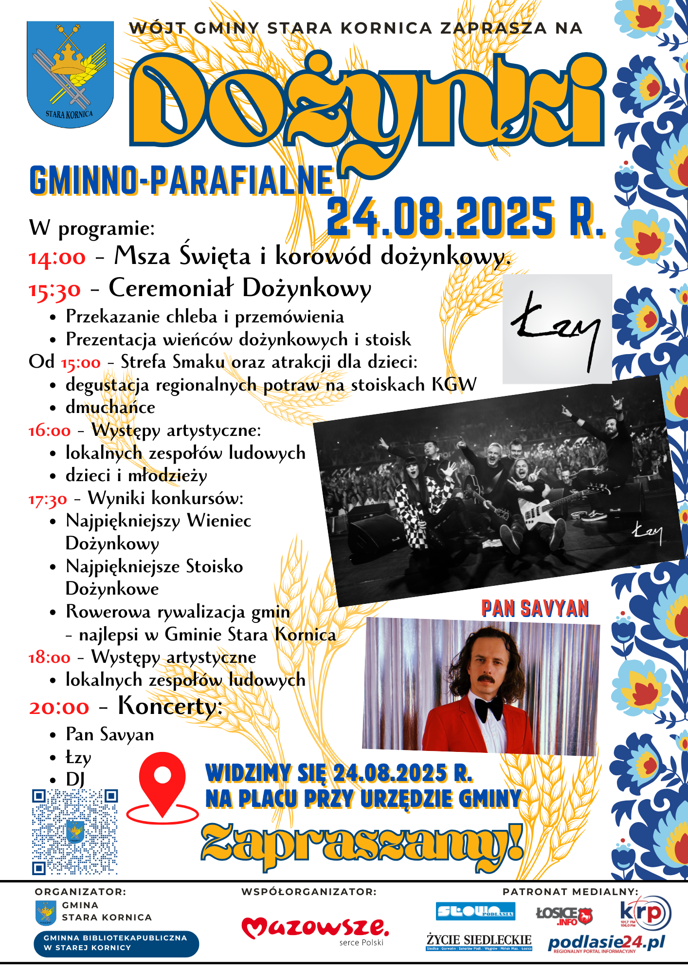 Organizatorzy – wójt gminy Stara Kornica oraz Gminna Biblioteka Publiczna – serdecznie zapraszają wszystkich do wspólnego świętowania i dzielenia się radością z zakończenia żniw. Wydarzenie dofinansowano z budżetu Samorządu Województwa Mazowieckiego. Patronat medialny objęło Słowo Podlasia.