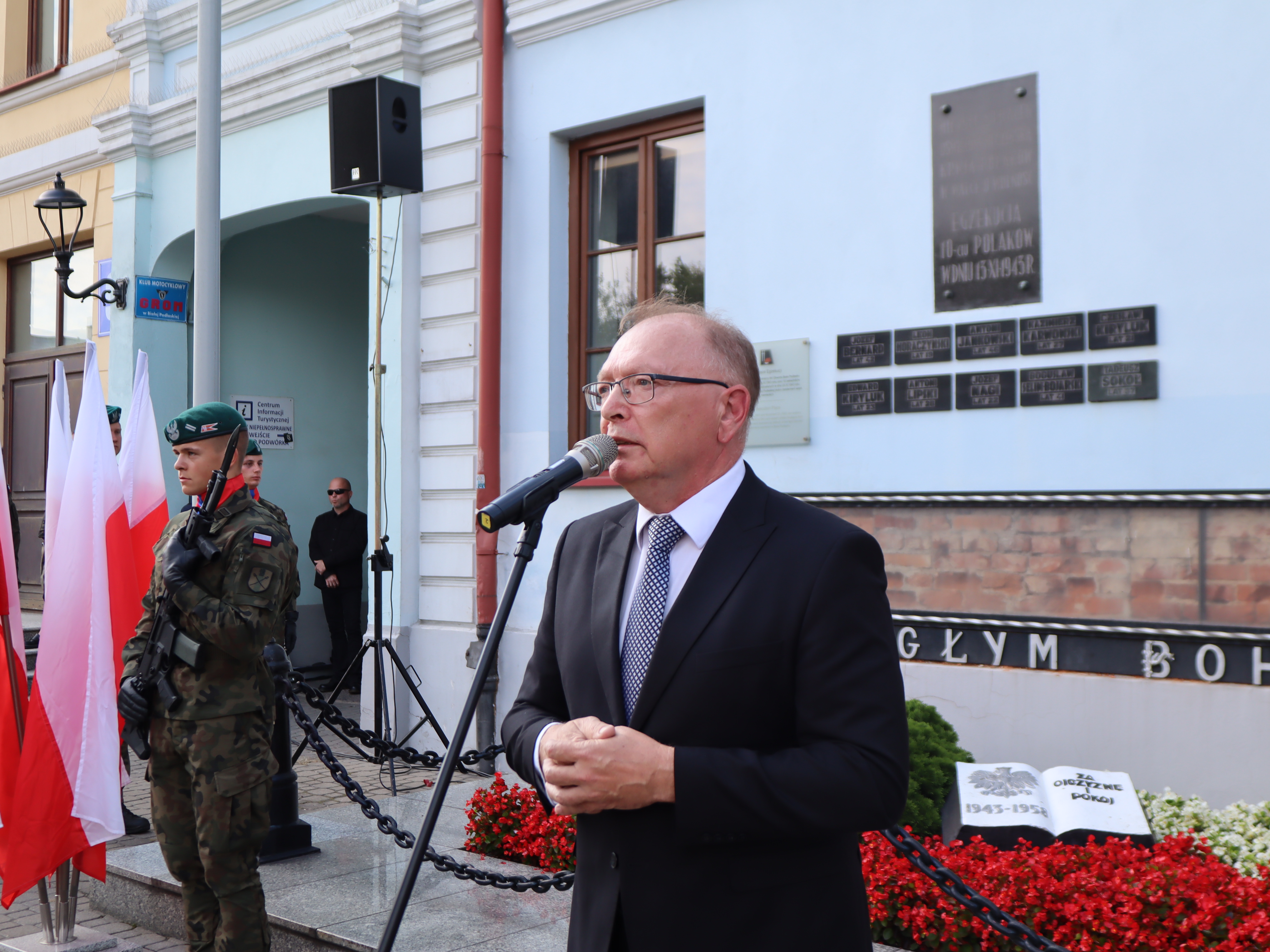 W imieniu prezydenta miasta Michała Litwiniuka, który nie był obecny, głos zabrał doktor Stanisław Romanowski, naczelnik Wydziału Edukacji i Spraw Społecznych Urzędu Miasta Biała Podlaska. W swoim przemówieniu nawiązał do tragicznej historii miejsca wokół którego tego dnia zebrał się tłum. To tu Niemcy zamordowali 26. mieszkańców miasta i okolic. Naukowiec przypomniał też genezę i cele powstania warszawskiego – zarówno wojskowe, jak i polityczne – a także jego miejsce w narodowej tożsamości. Wspomniał też o wypowiedzi, którą tego samego dnia usłyszał z ust byłego powstańca, pułkownika Jerzego Filipowicza. – Powiedział piękne i proste, oczywiste wręcz zdanie, że wolności nie zdobywa się na kolanach – zacytował.