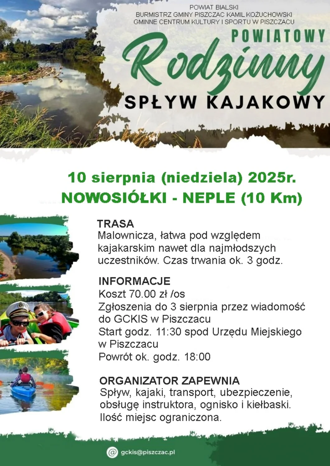 Koszt udziału to 70 zł od osoby. W cenie zawarte są: transport, wypożyczenie kajaków, ubezpieczenie, opieka instruktorska i poczęstunek przy ognisku. Liczba miejsc jest ograniczona – decyduje kolejność zgłoszeń, które przyjmowane są do 3 sierpnia przez wiadomość do Gminnego Centrum Kultury i Sportu w Piszczacu (e-mail: [email protected]).