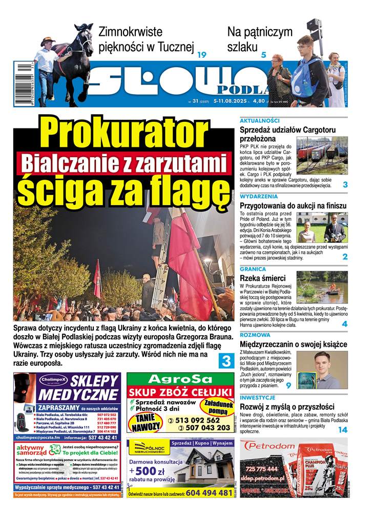 - Prokurator ściga za flagę. Bialczanie z zarzutami. Sprawa dotyczy incydentu z flagą Ukrainy z końca kwietnia, do którego doszło w Białej Podlaskiej. Podczas wizyty europosła Grzegorza Brauna. Wówczas z miejskiego ratusza uczestnicy zgromadzenia zdjęli flagę Ukrainy. Trzy osoby usłyszały już zarzuty. Wśród nich nie ma na razie europosła.
