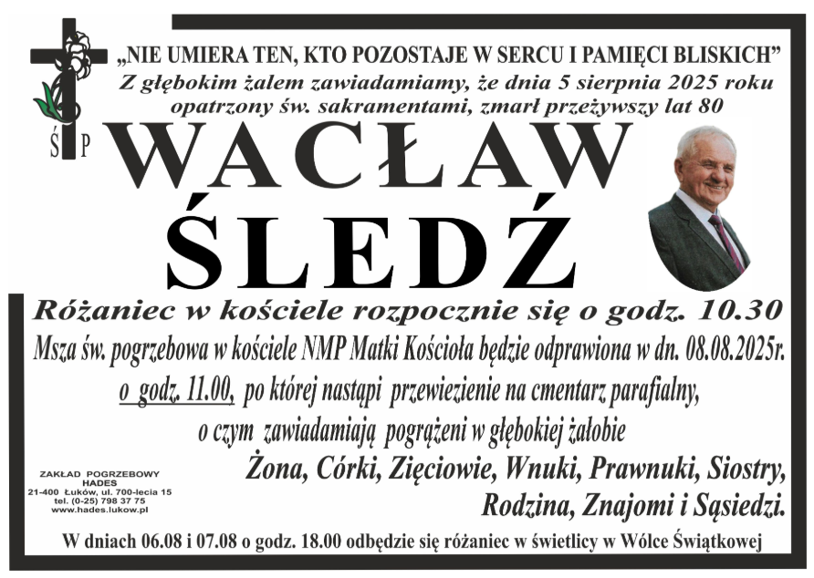 Msza święta pogrzebowa w kościele pw. NMP Matki Kościoła w Łukowie będzie odprawiona 8 sierpnia o godzinie 11.00. Po niej nastąpi przewiezienie na cmentarz parafialny,