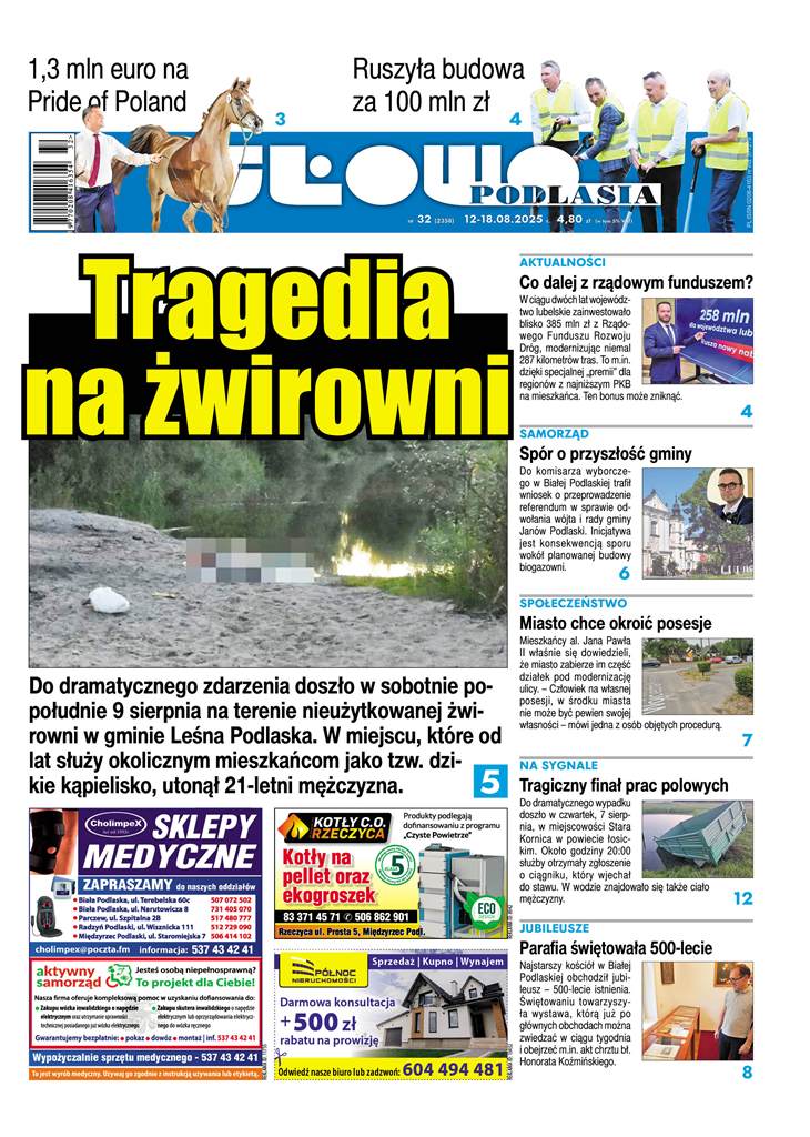 - Tragedia na żwirowni. Do dramatycznego zdarzenia doszło w sobotnie popołudnie, 9 sierpnia na terenie nieużytkowanej żwirowni w gminie Leśna Podlaska. W miejscu, które od lat służy okolicznym mieszkańcom jako tzw. dzikie kąpielisko, utonął 21-letni mężczyzna.