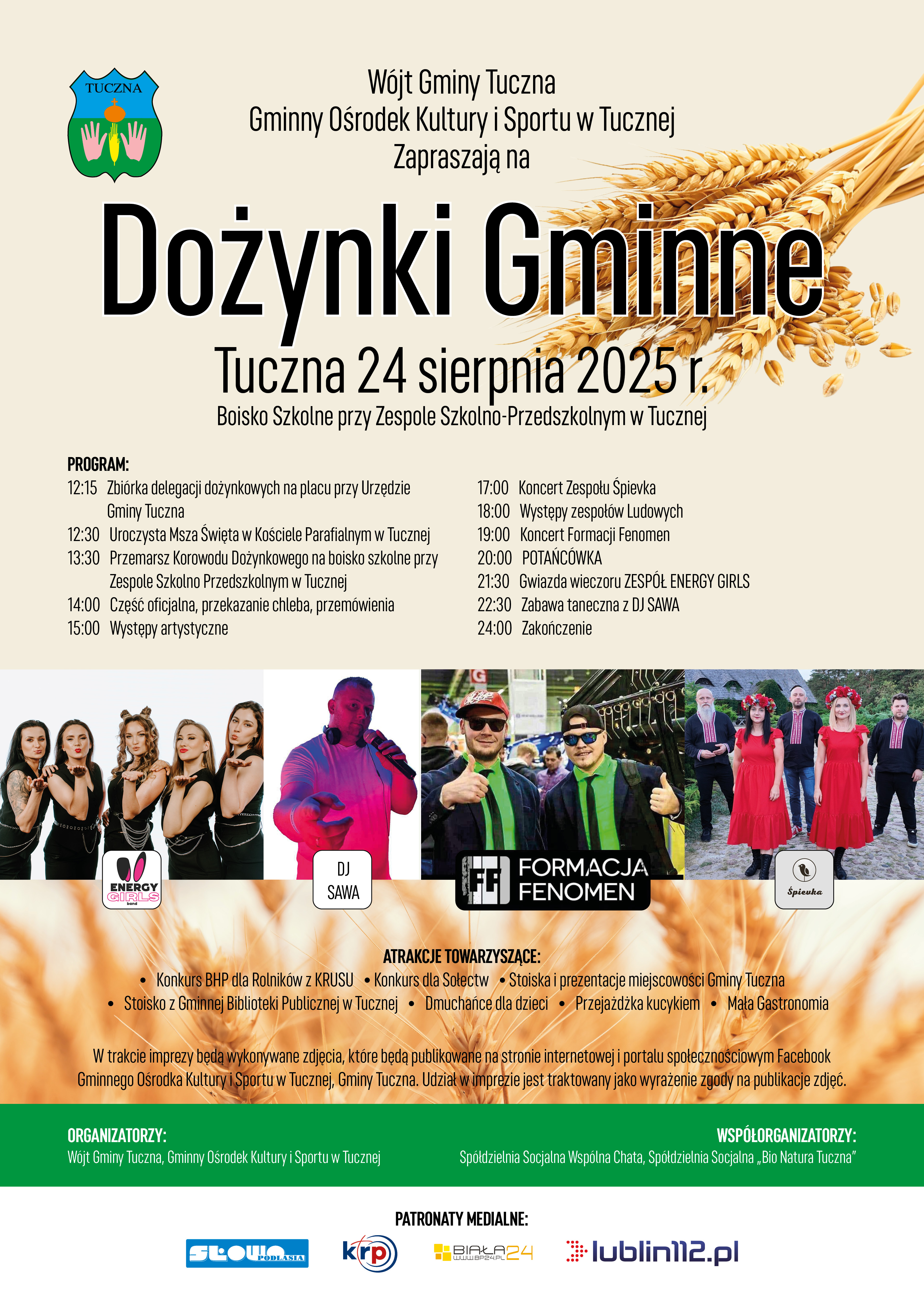 Już 24 sierpnia, o godzinie 12.15 rozpocznie się zbiórka delegacji dożynkowych na placu przy urzędzie gminy Tuczna. Następnie o 12.30 odbędzie się uroczysta msza święta w kościele parafialnym w Tucznej, a o 13.30 korowód dożynkowy przejdzie na boisko szkolne.