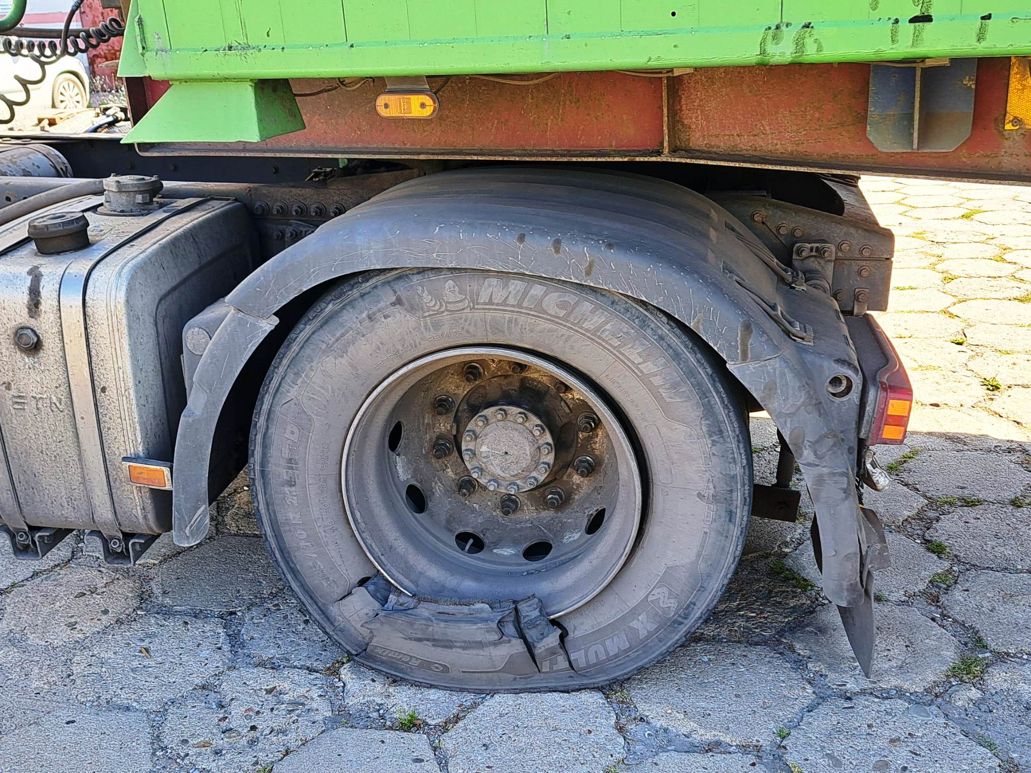 „Podczas mijania się dwóch pojazdów: samochodu ciężarowego i osobowego, nastąpiło pęknięcie opony w ciężarówce. Skutkiem tego doszło do uszkodzenia pojazdu osobowego, który automatycznie wysłał sygnał SOS.” – informuje KM PSP w Białej Podlaskiej.
