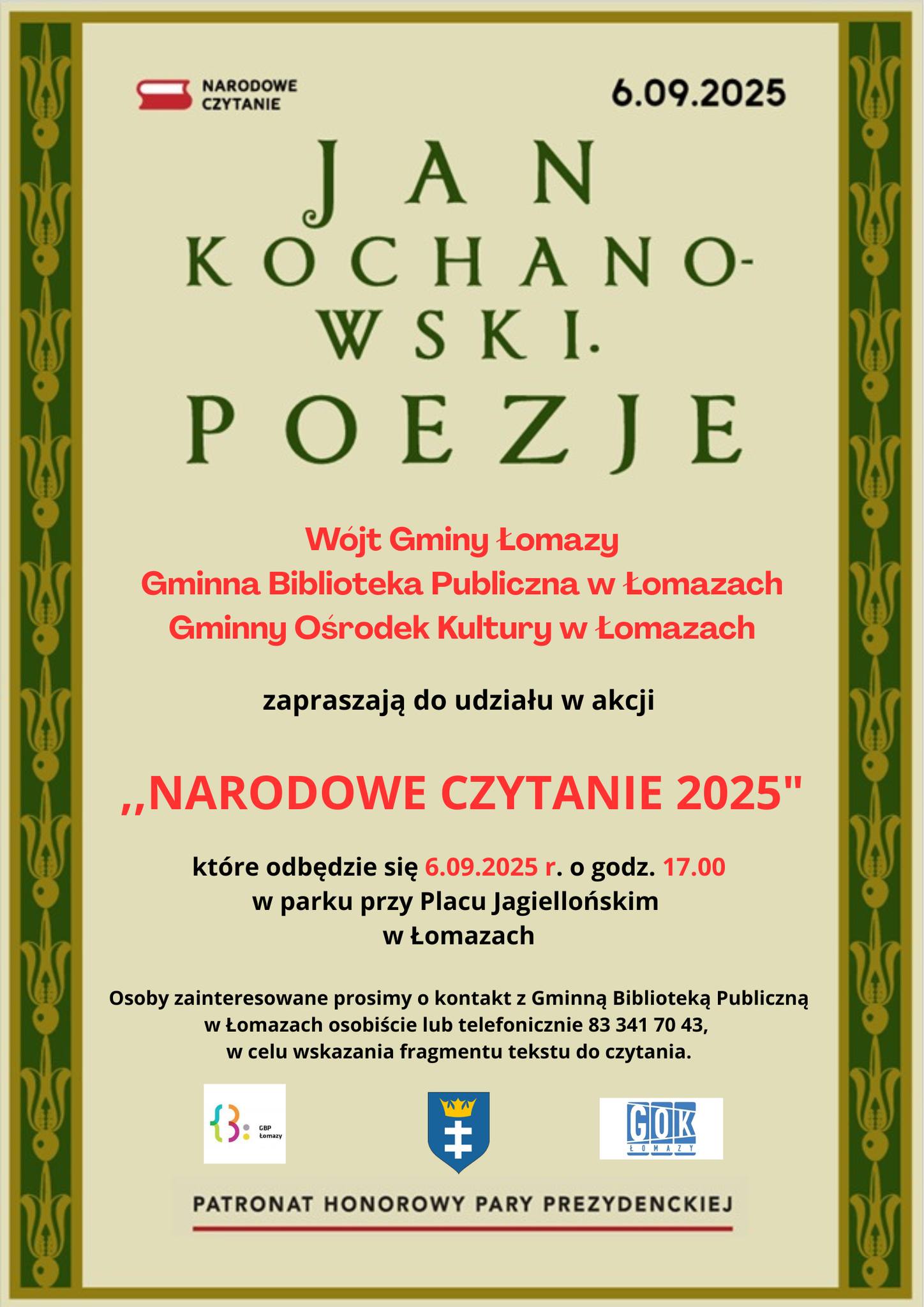 Narodowe Czytanie to inicjatywa prezydenta RP, która ma na celu popularyzację polskiej literatury i wzmacnianie poczucia narodowej tożsamości. Co roku wybierany jest inny autor lub dzieło, a wspólne głośne czytanie staje się prawdziwym świętem słowa.