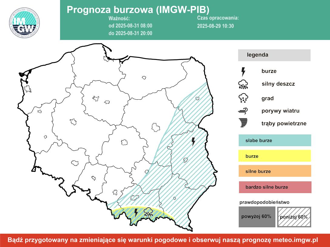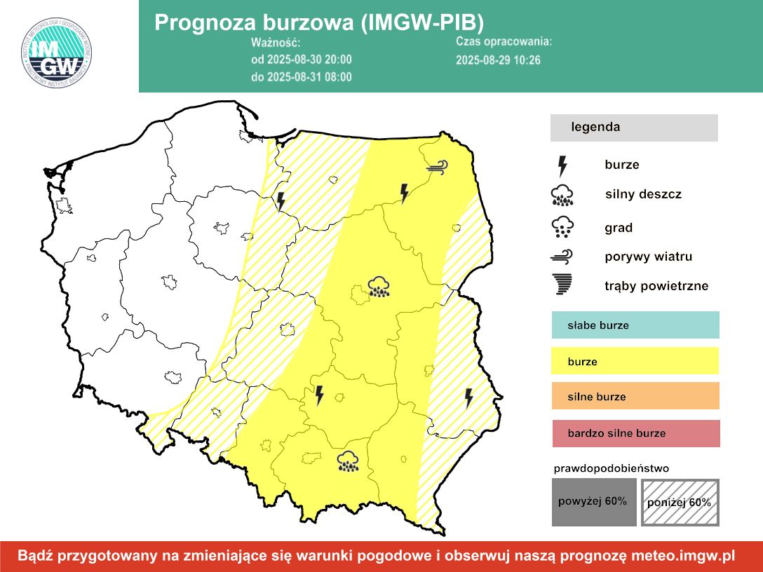 Wiatr skręci z południowego na zachodni, umiarkowany, w porywach do 35 km/h. Wieczór nie przyniesie ochłodzenia – temperatura utrzyma się na poziomie 26–28°C. W drugiej części nocy zachmurzenie wzrośnie, a miejscami pojawią się burze z opadami do 20 mm. Podczas ich przechodzenia wiatr może wiać w porywach do 60 km/h, a ciśnienie wzrośnie do 1006 hPa.