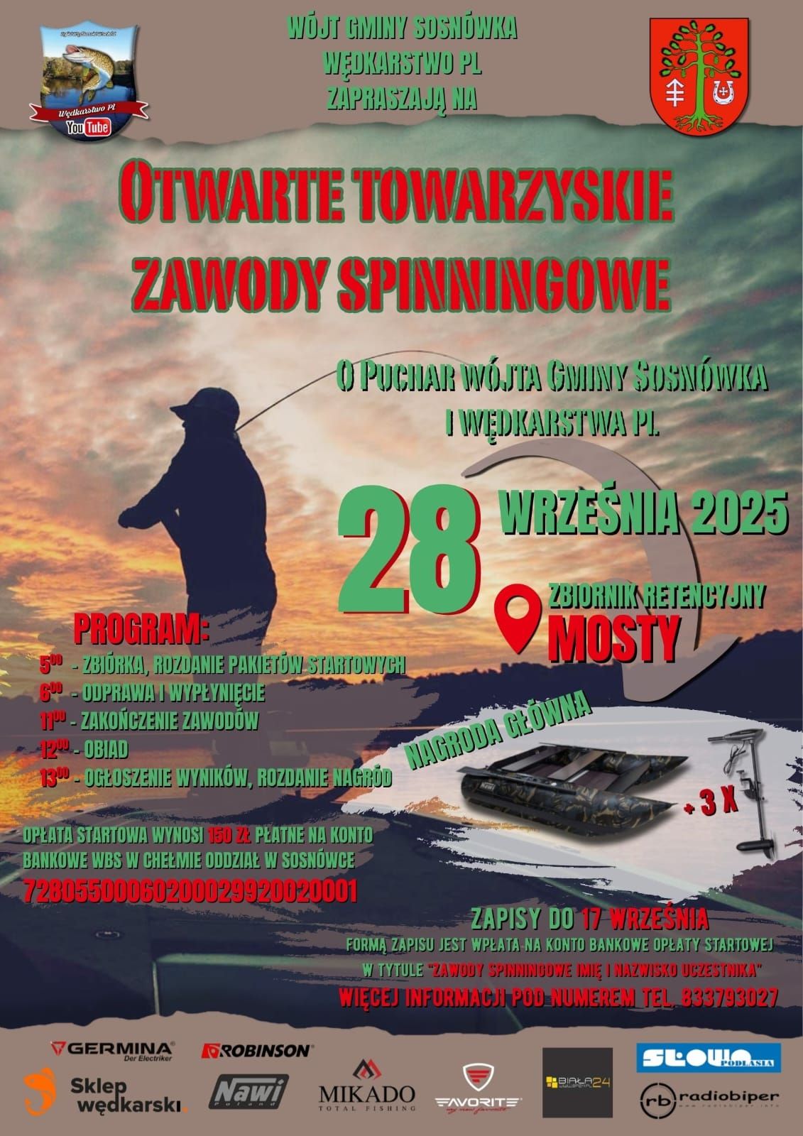 Opłata startowa wynosi 150 zł. Zgłoszenia przyjmowane są do 17 września 2025 roku. Wpłat należy dokonywać na konto bankowe WBS w Chełmie, Oddział w Sosnówce, z dopiskiem "Zawody spinningowe Imię i Nazwisko uczestnika".